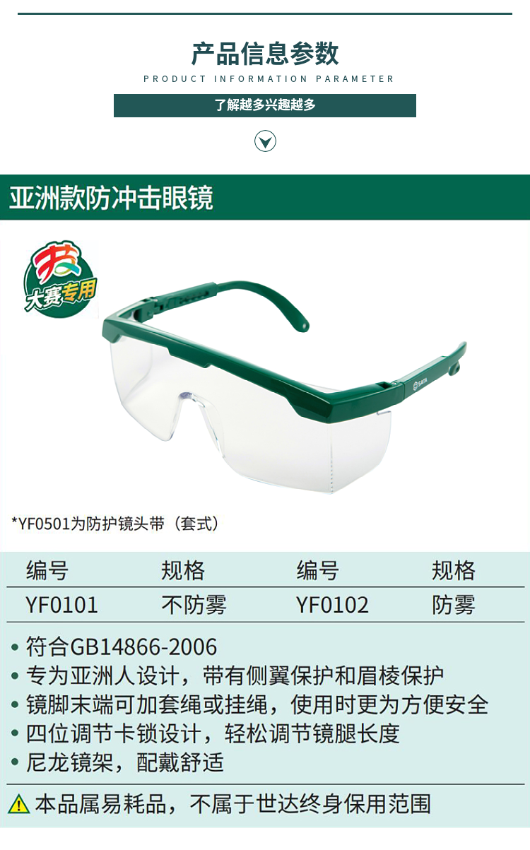 YF0101 anti-shock glasses (not anti-fog) YF0102 anti-shock glasses (anti-fog) YF0203 full view goggles (not anti-fog) YF0204 full view