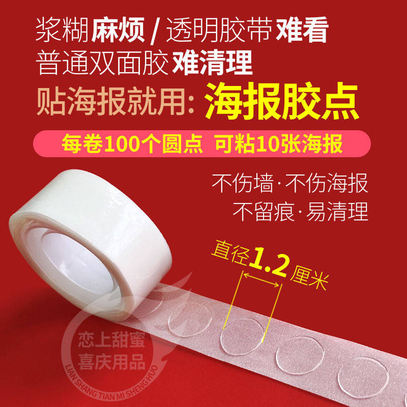 1 roll of adhesive dot (can adhesive 10 posters) 2 roll of glue dots (can adhesive 20 posters) 3 roll of glue dots (can adhesive 30 posters) 4 roll of rubber dots (can adhesive 40 posters) 5 roll of rubber dots