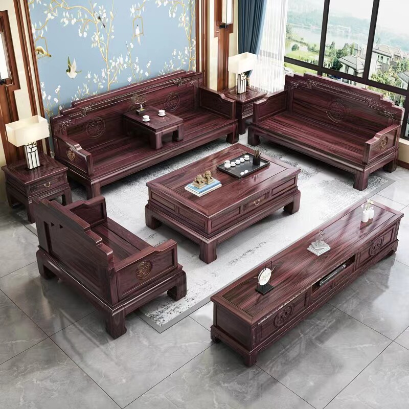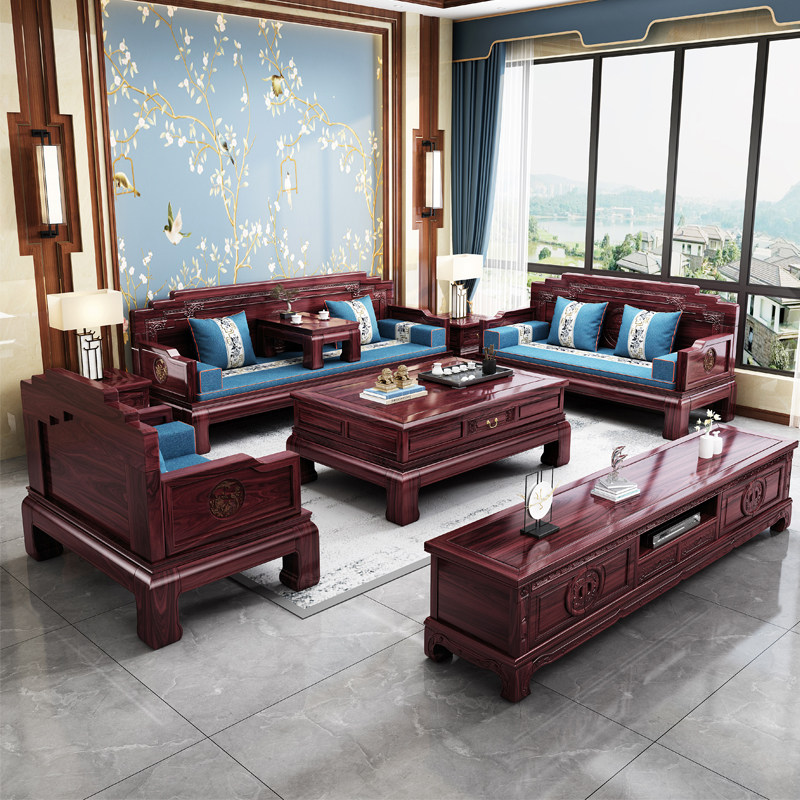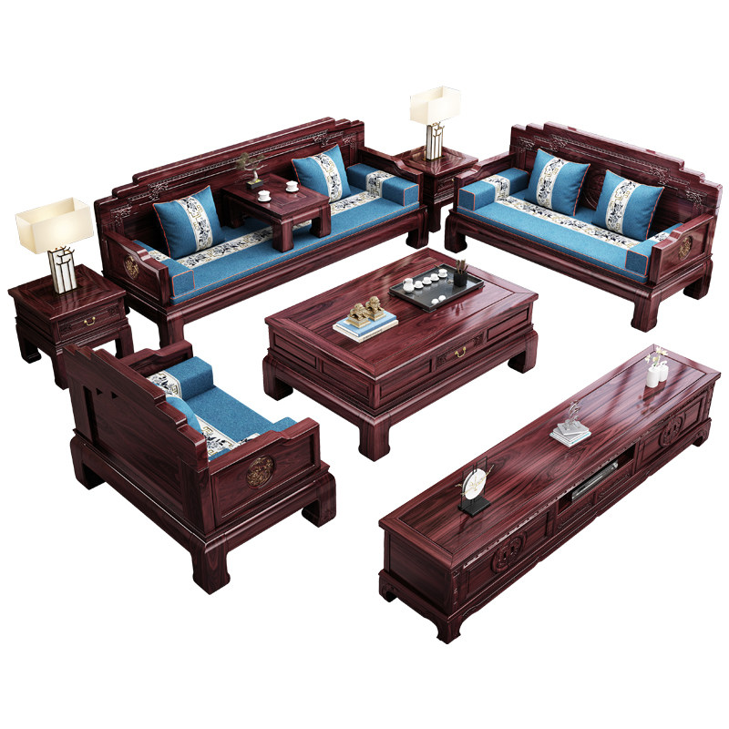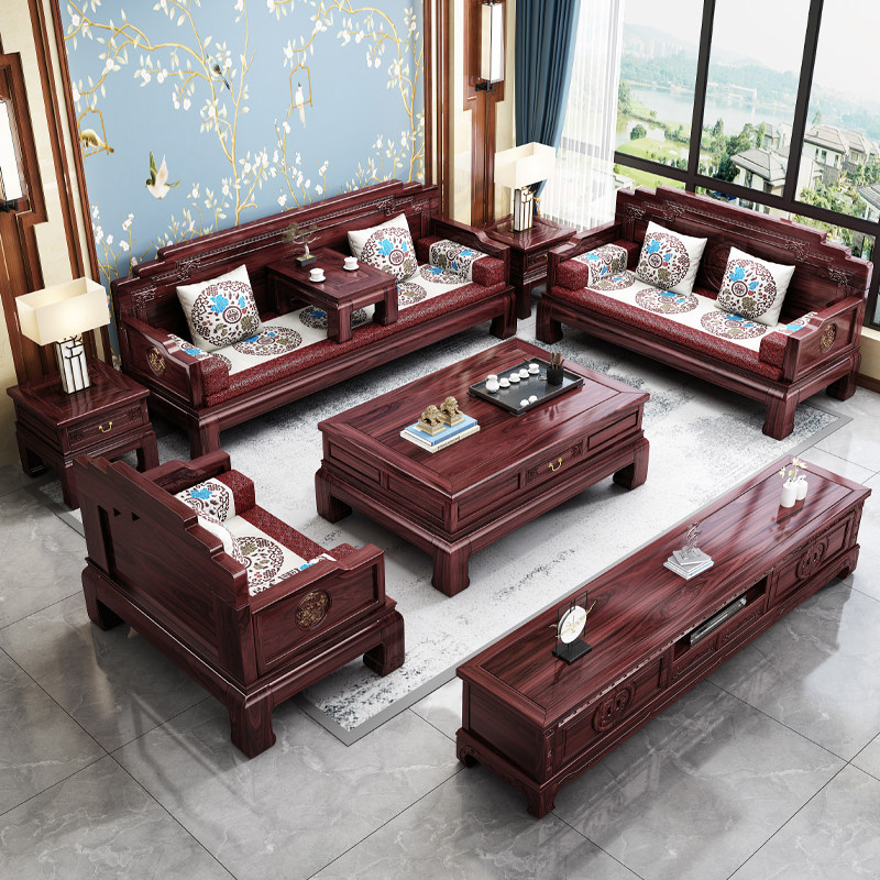 New Chinese style solid wood sofa classical carved national color and heavenly fragrance living room combination winter and summer dual-use Chinese style ebony wood sofa