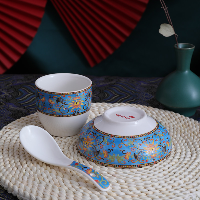 Mongolian element milk tea bowl spoon plate cup four-piece package hotel restaurant restaurant table ceramic Mongolian tableware