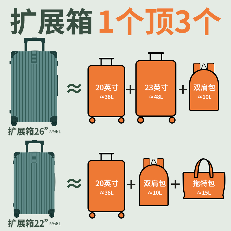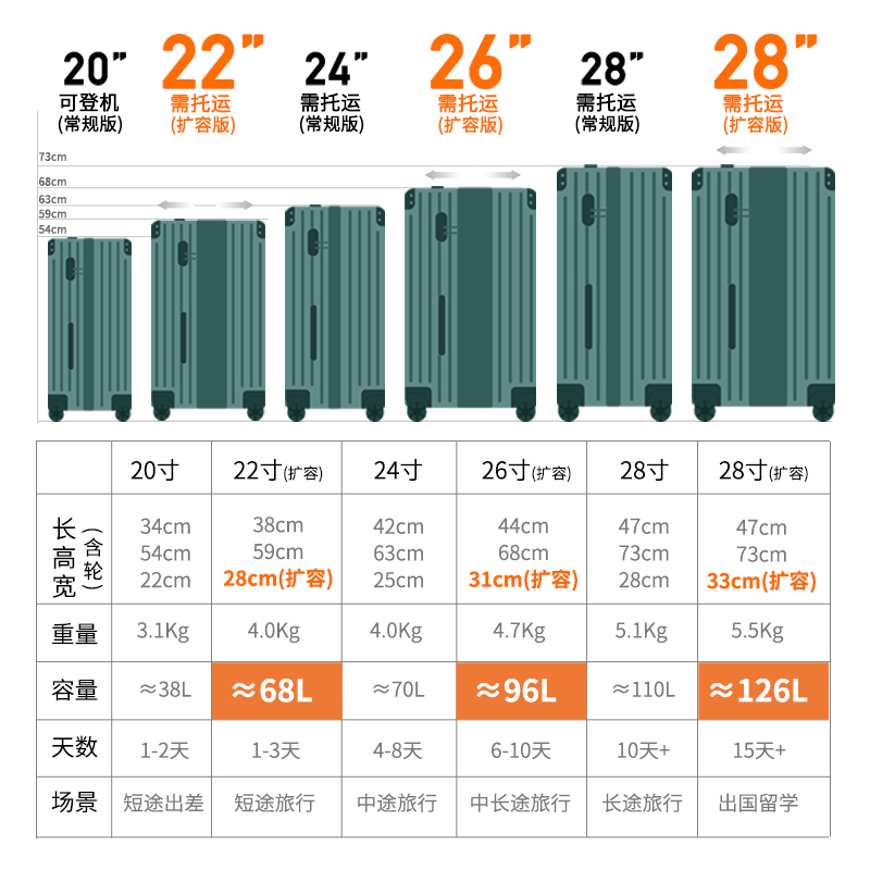 20 inches (can be boarded, suitable for 1-3 days of travel) 22 inches (short trips are suitable for 3-5 days of travel) 24 inches (halfway trips are suitable for 6-10 days of travel) 26 inches (medium
