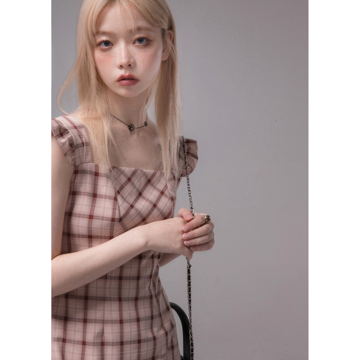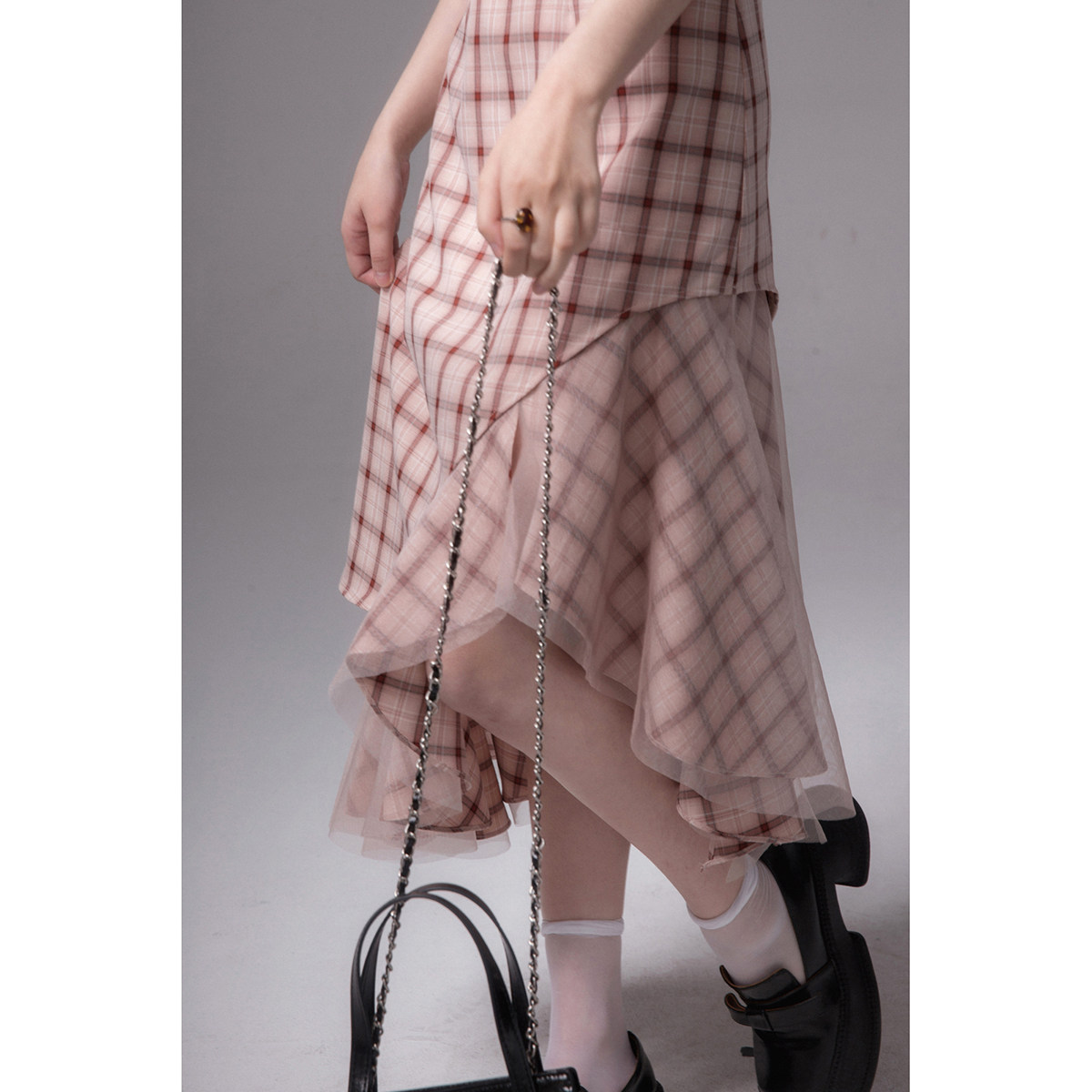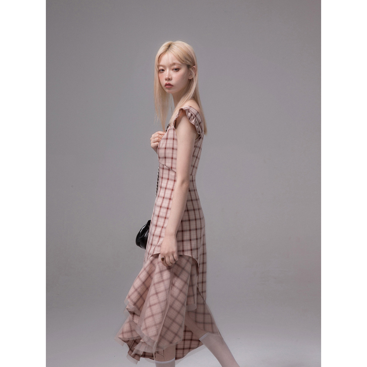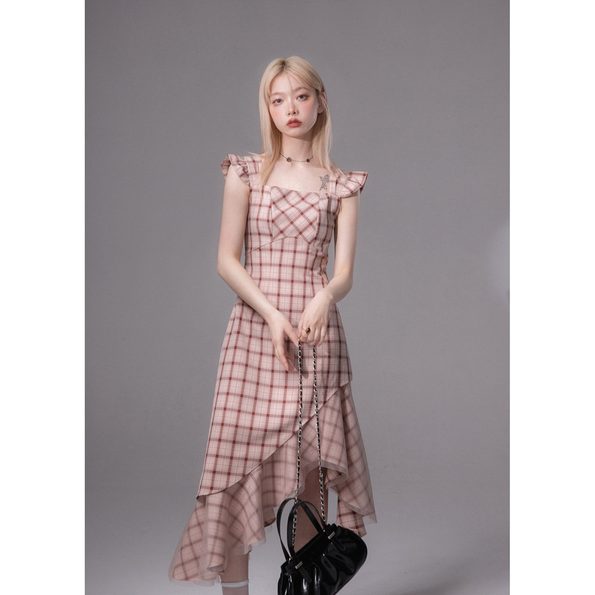 COTER Independent Design Rose Bean Paste Art Texture Fishtail Plaid Irregular Hem Suspender Dress