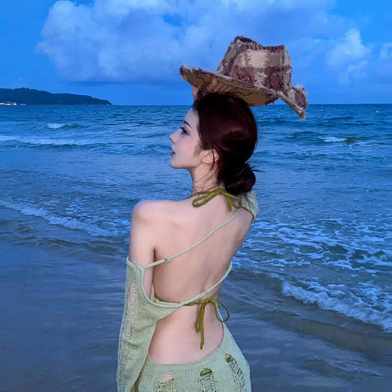 Swimsuit female INS Wind-style green knit broken hole bikini long sleeve sunscreen with small breasts to woo back-Taobao
