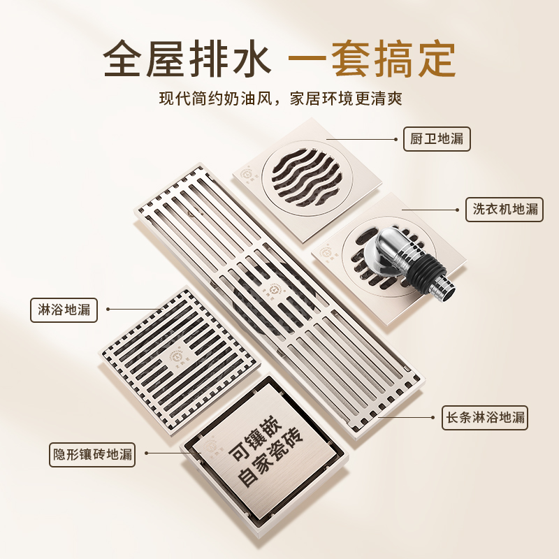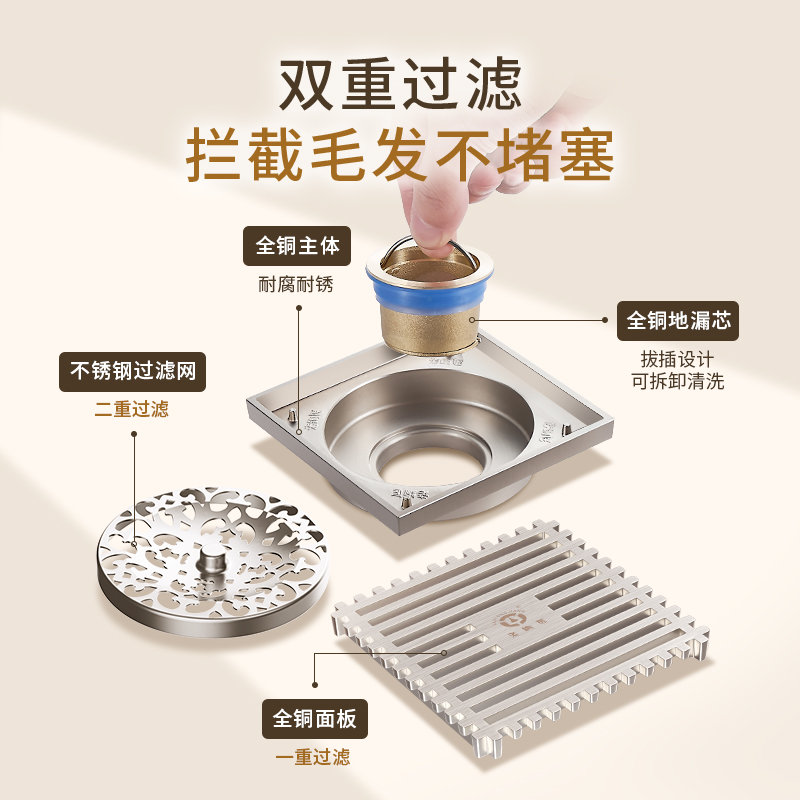 1 kitchen guard floor drain (full copper deodorant core) 2 shower floor drain (full copper deodorant core) 3 washing machine floor drain (with elbow) (full copper deodorant core) 4 washing machine floor drain (with tee) (full copper anti -