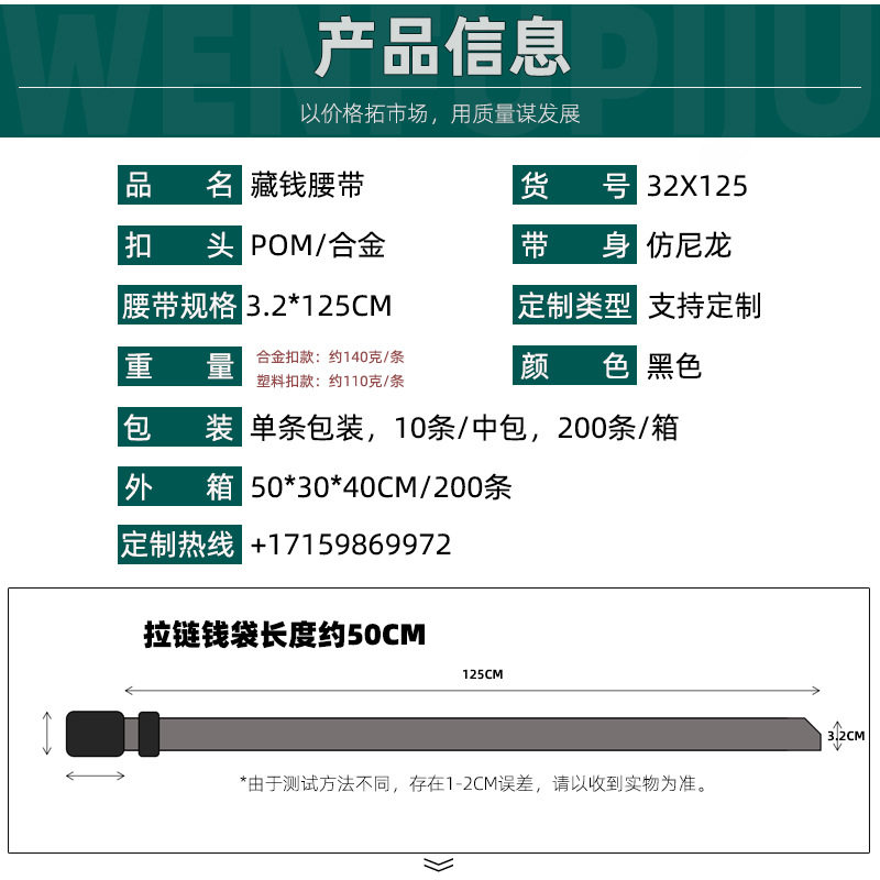 Cross-border supply of goods 32X125 alloy buckle nylon hidden money belt ladies outdoor zipper hidden wallet safety pants
