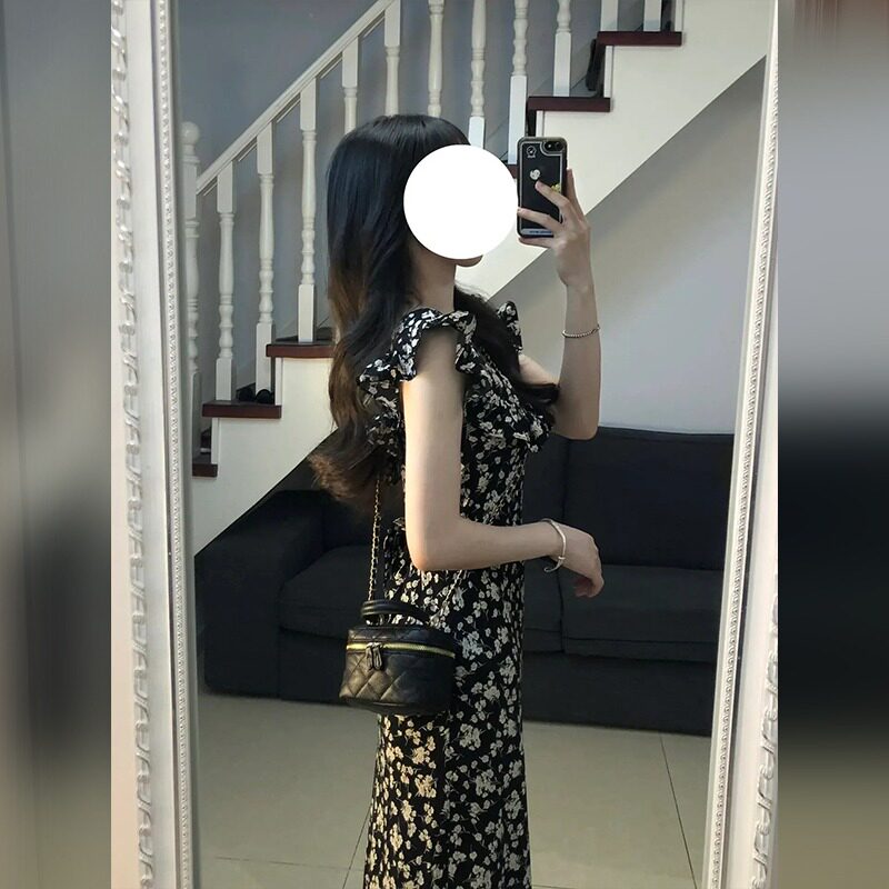 Tea break black floral dress, high-end, retro, casual, slim, tall, long skirt for women, summer