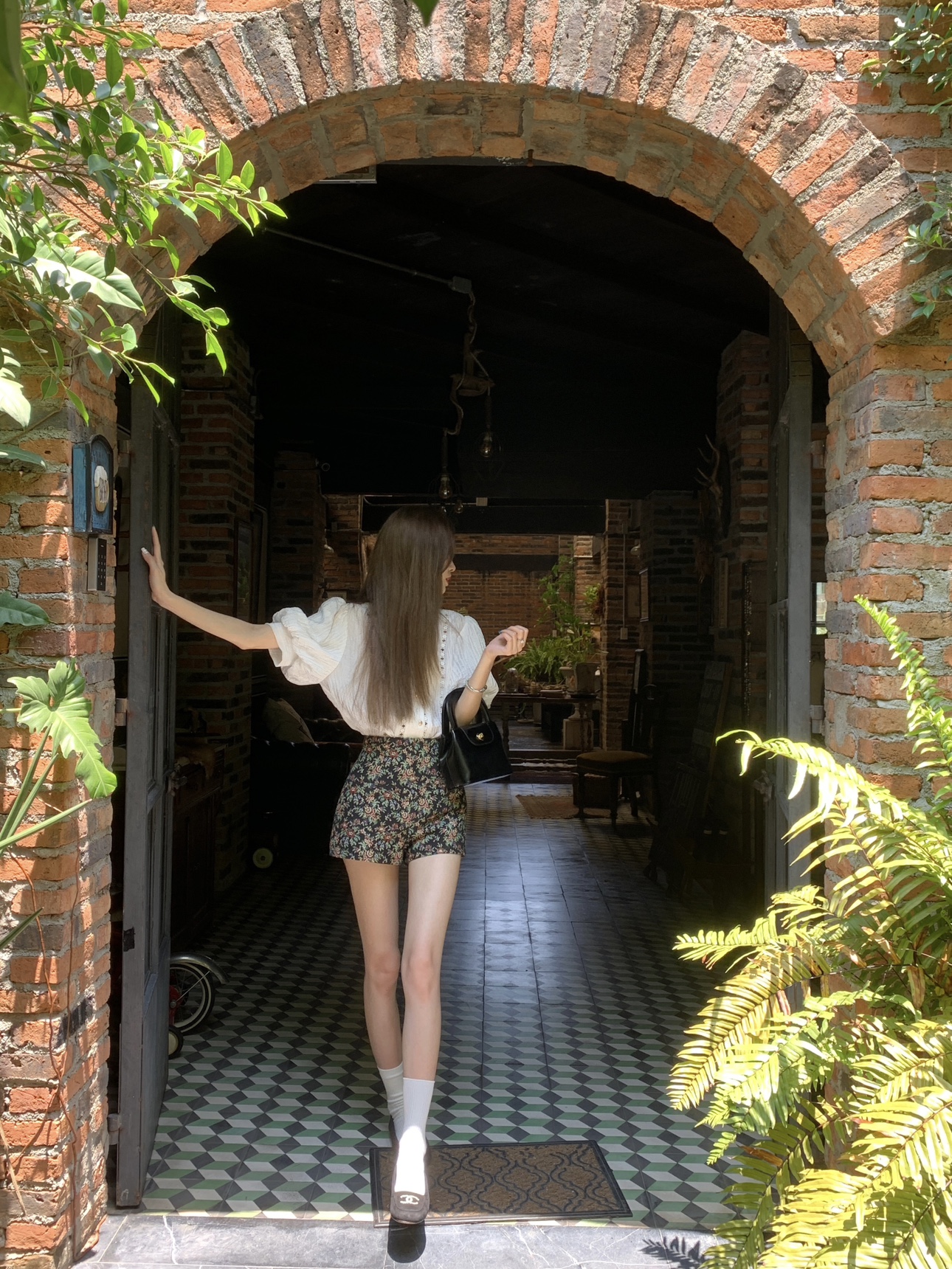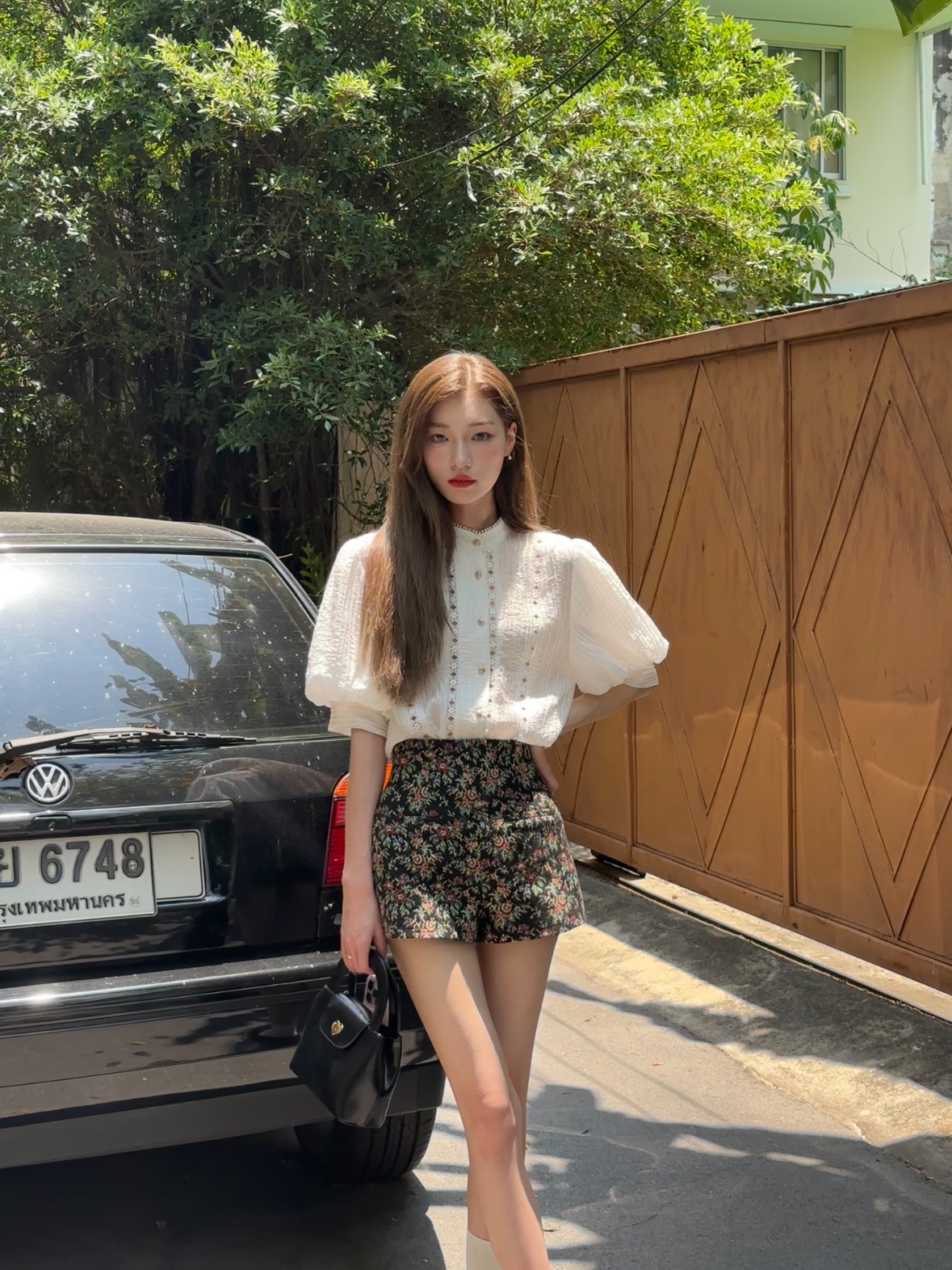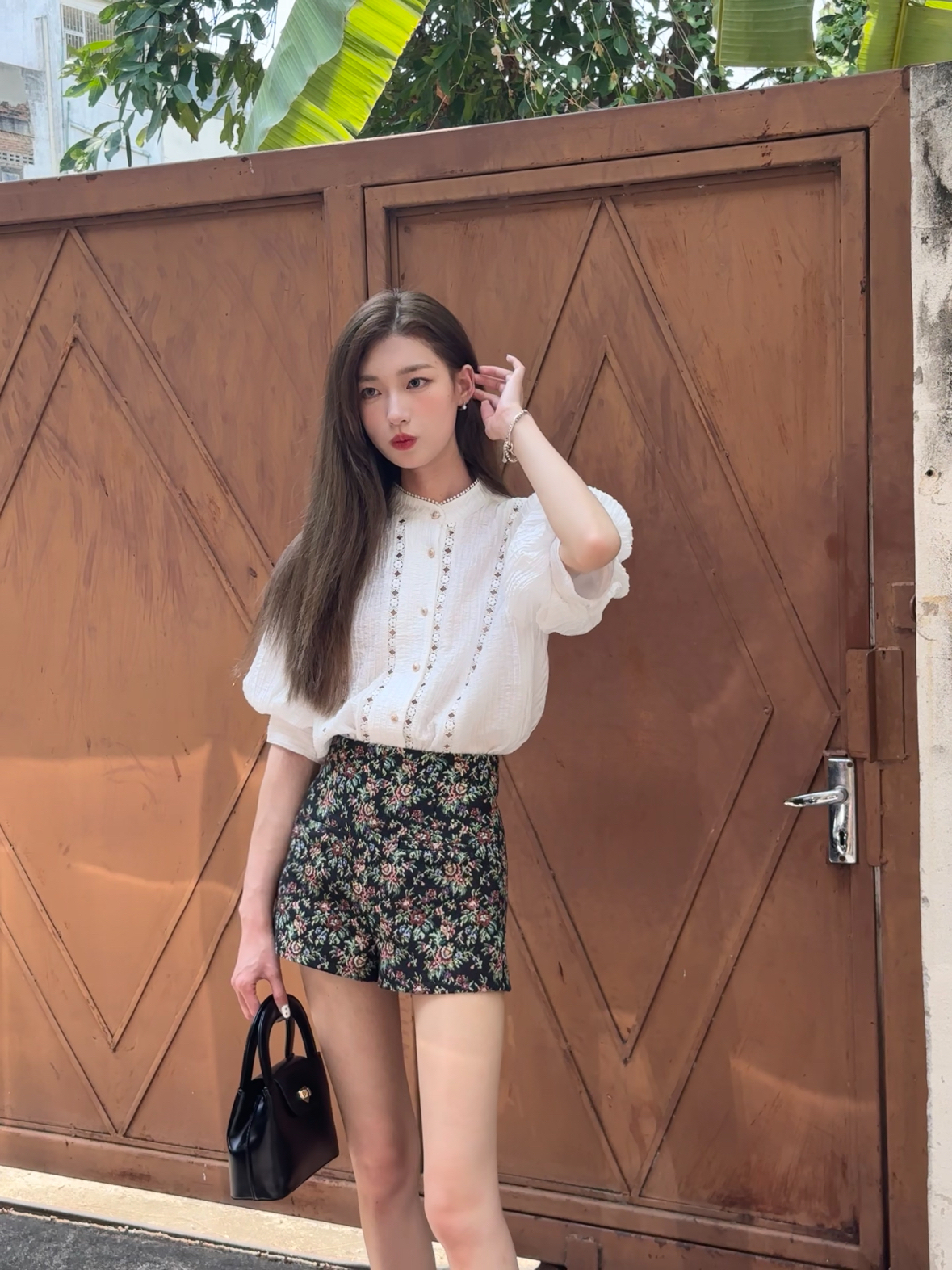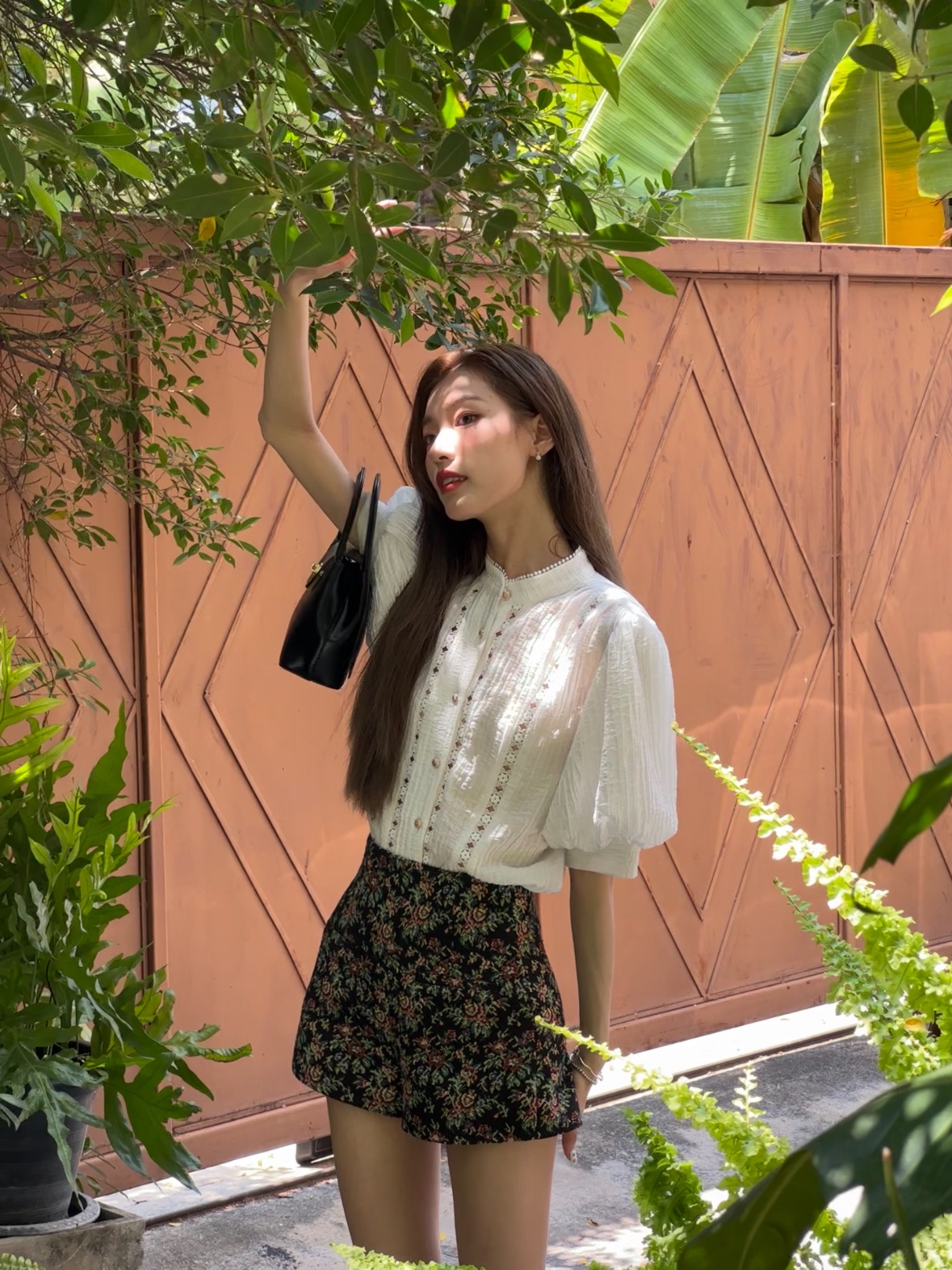 SourceWithU Nanyang Daughter 80 Tencel Noble Lady Hollow Puff Sleeve French Shirt Top