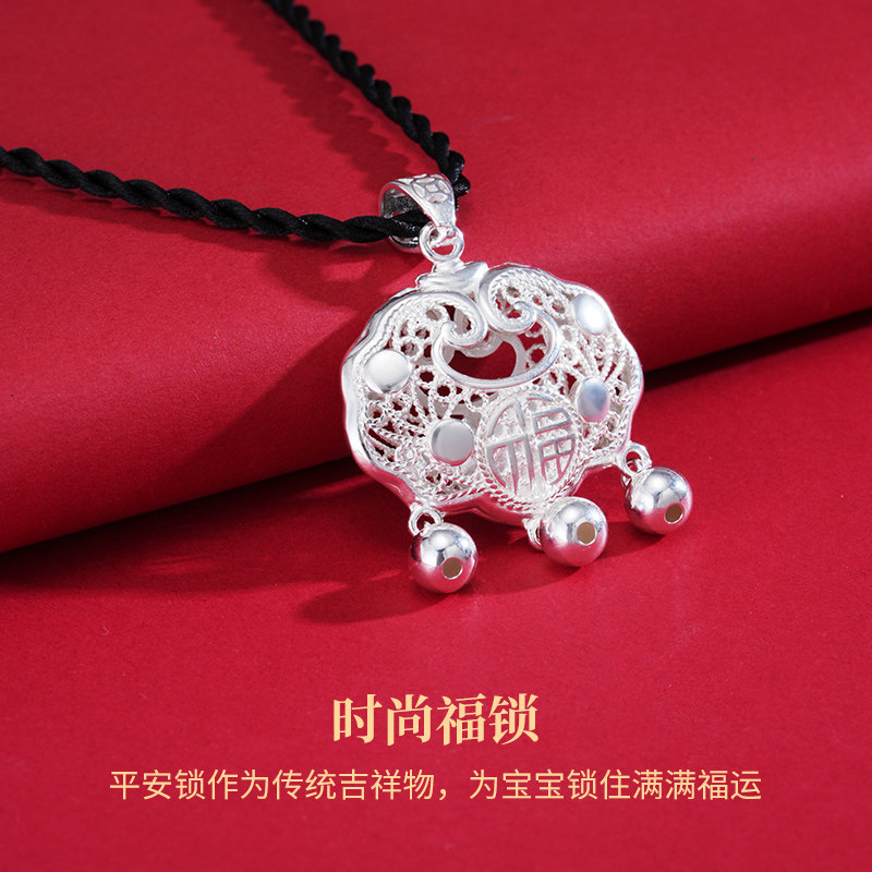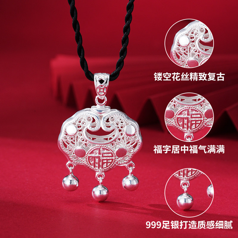 Hollowed-out flower silk blessing character silver lock black rope (round bell pan) hollowed-out flower silk blessing character silver lock red rope (round bell pan) (large number 10 gr) hollowed-out flower silk blessing character silver lock black rope (round bell pan) (large