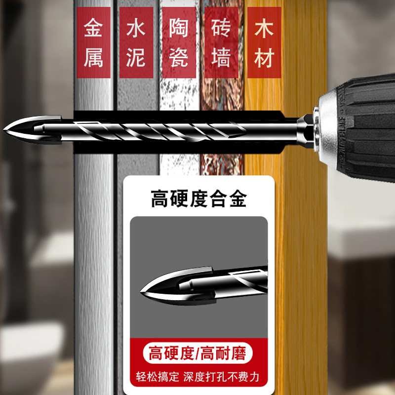 Full porcelain tile perforated drill with high hardness tungsten steel alloy 4-edged barking diamond triangular glass magnetic brick impact electric drill