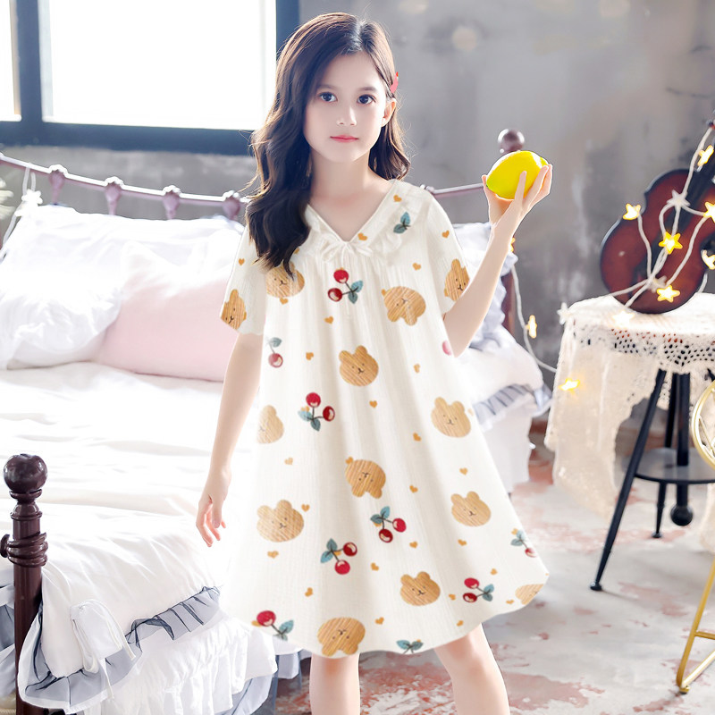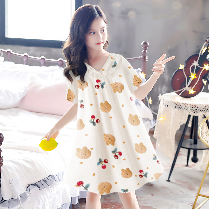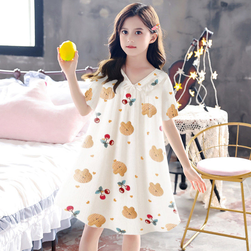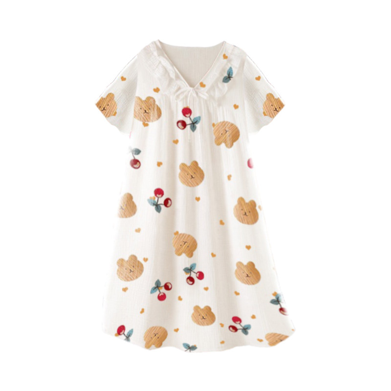 Girls nightgown summer short-sleeved cotton gauze pajamas thin sweet and cute student spring and summer loose home clothes bear