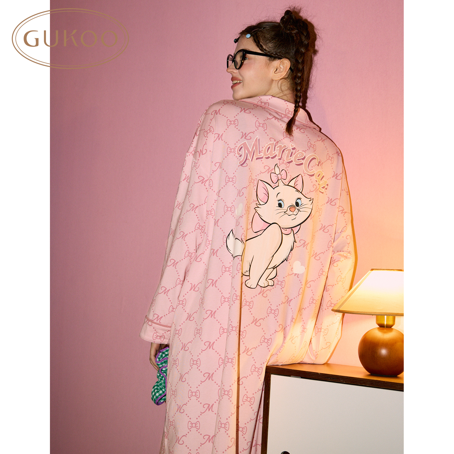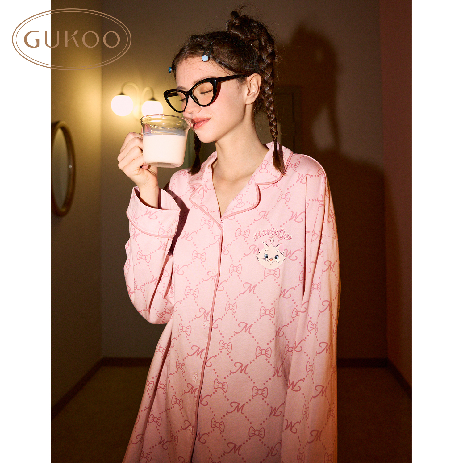Gukoo Fruit Shell Sleeping Skirt Woman Fall Pink Mary Cat New Shirt Collar Pure Cotton Lady Home Sleeping Dress C-Taobao