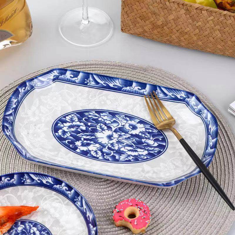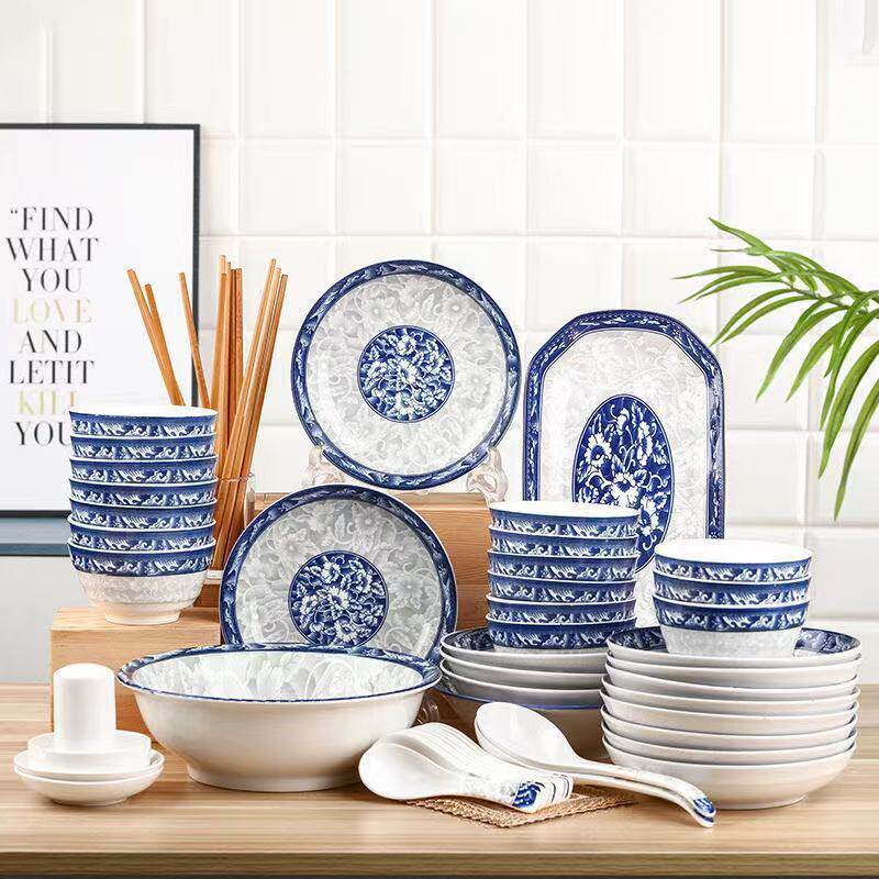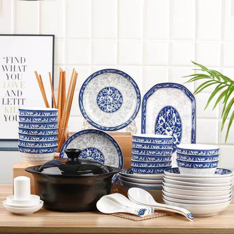 Ten bowls, ten plates, bowls and dishes set, plate fish plate, large noodle soup, bowl and plate combination, household meal bowls and chopsticks blue and white