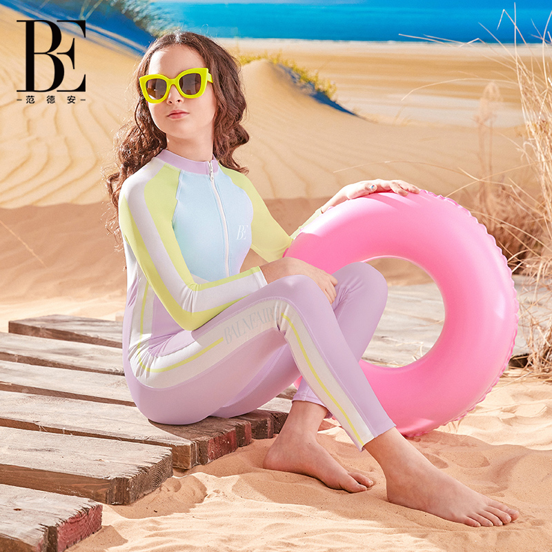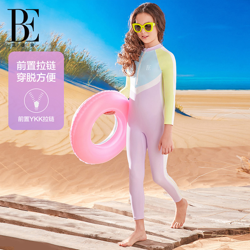 BE Fan De'an 2025 children's one-piece swimsuit for girls, long pants, long sleeves, sun protection, conservative fashion, sports for older children