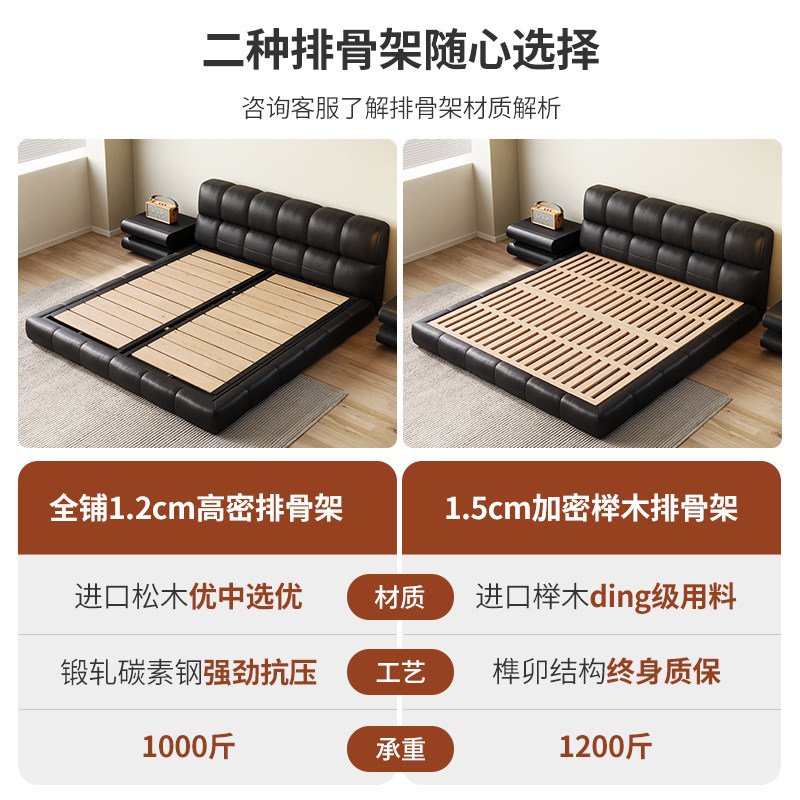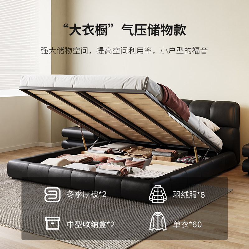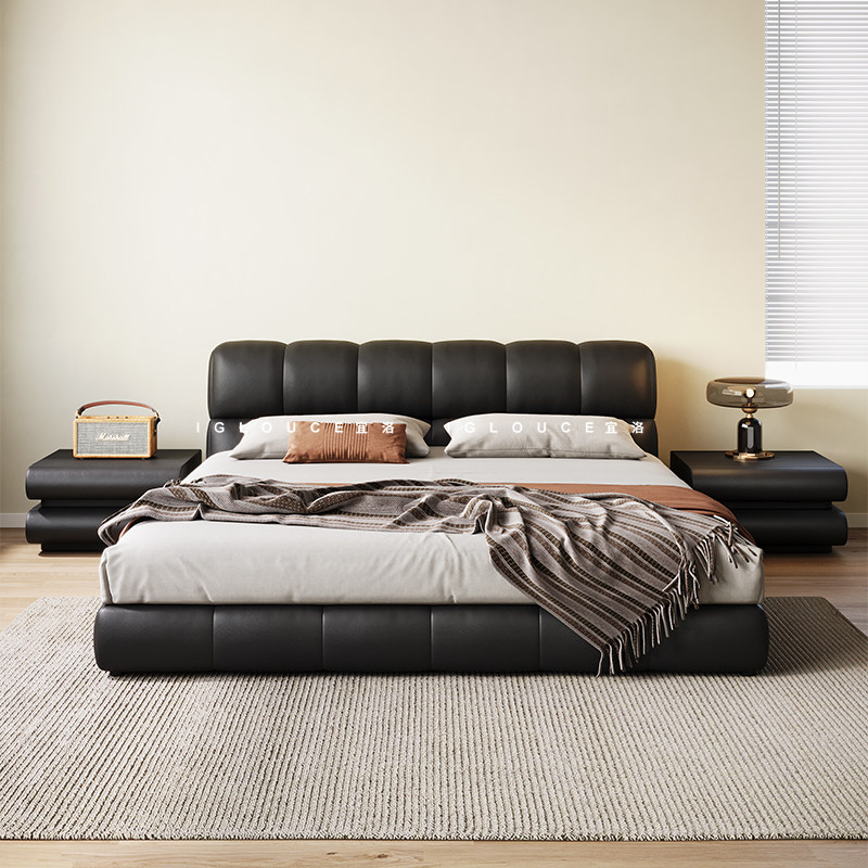 Iloaf puff bed willy-style extremely simple genuine leather bed black modern minimalist master bedroom with light lavish soft bag bed floor storage bed-Taobao