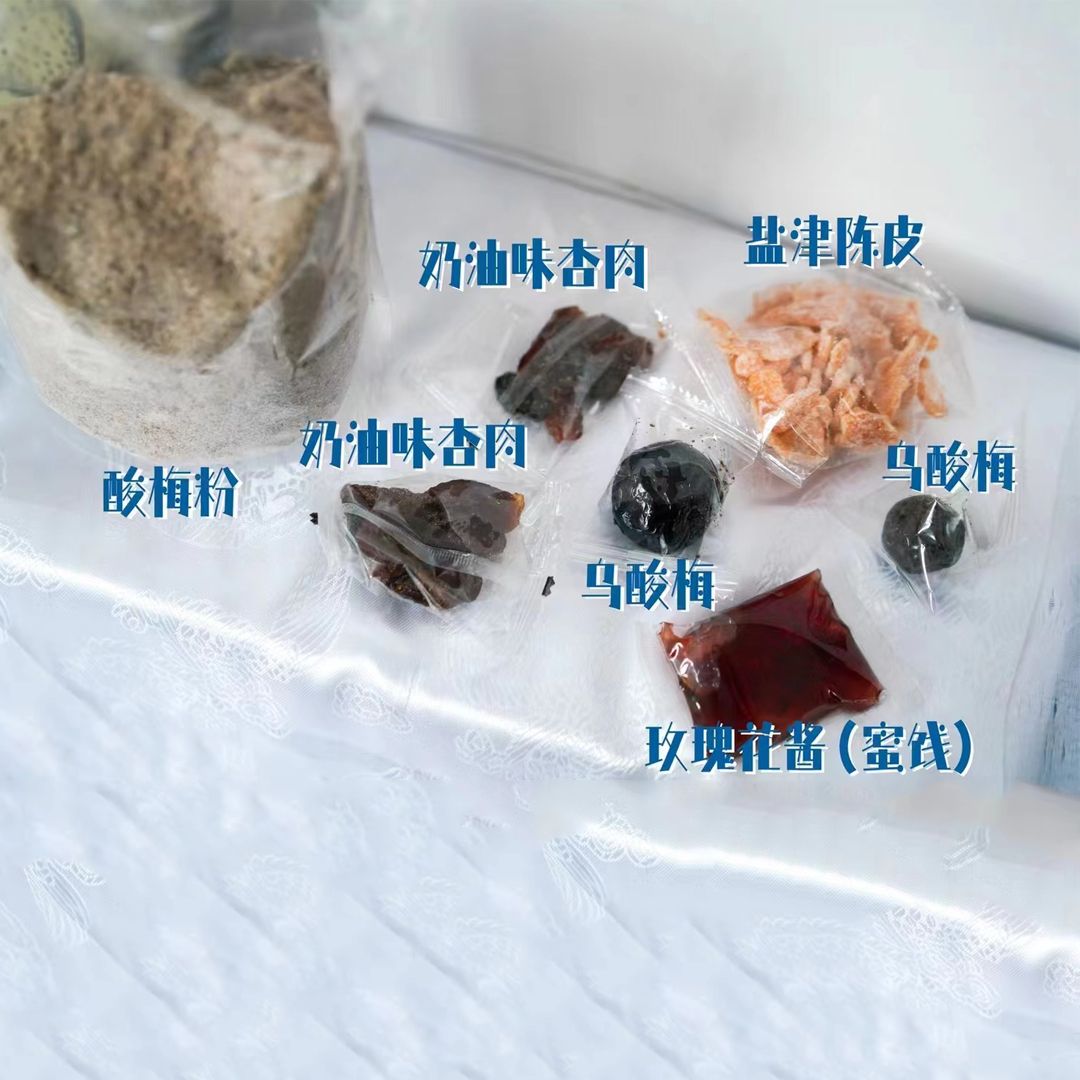 Hawthorn, ebony, apricot, plum, jujube, tangerine peel, sucrose, glucose, brown sugar, rose sauce, osmanthus sauce