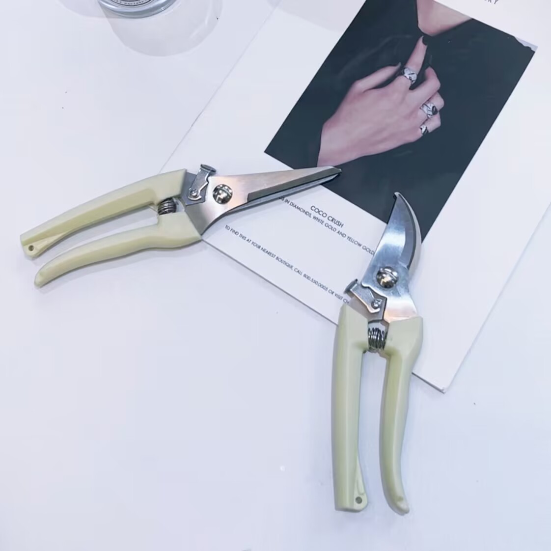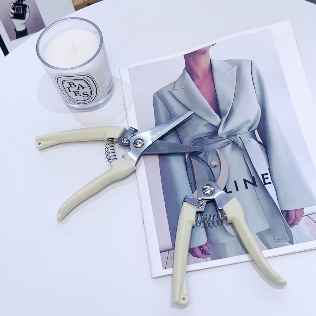 Straight cut one (home cut fine branch) bends a hand (home cut coarse branch) straight cut bent cut pink scissors a blue scissors a pink scissors blue scissors
