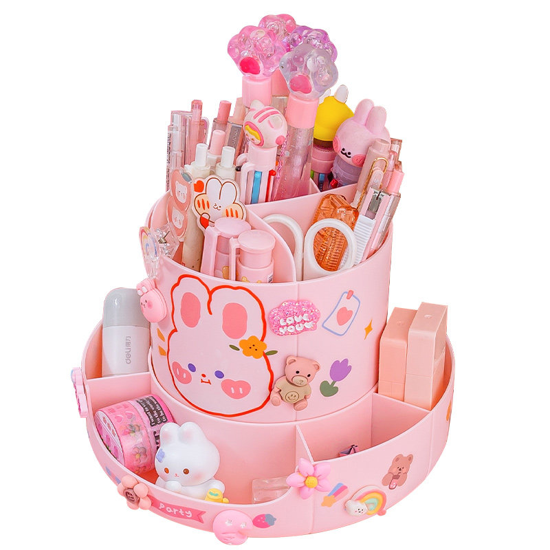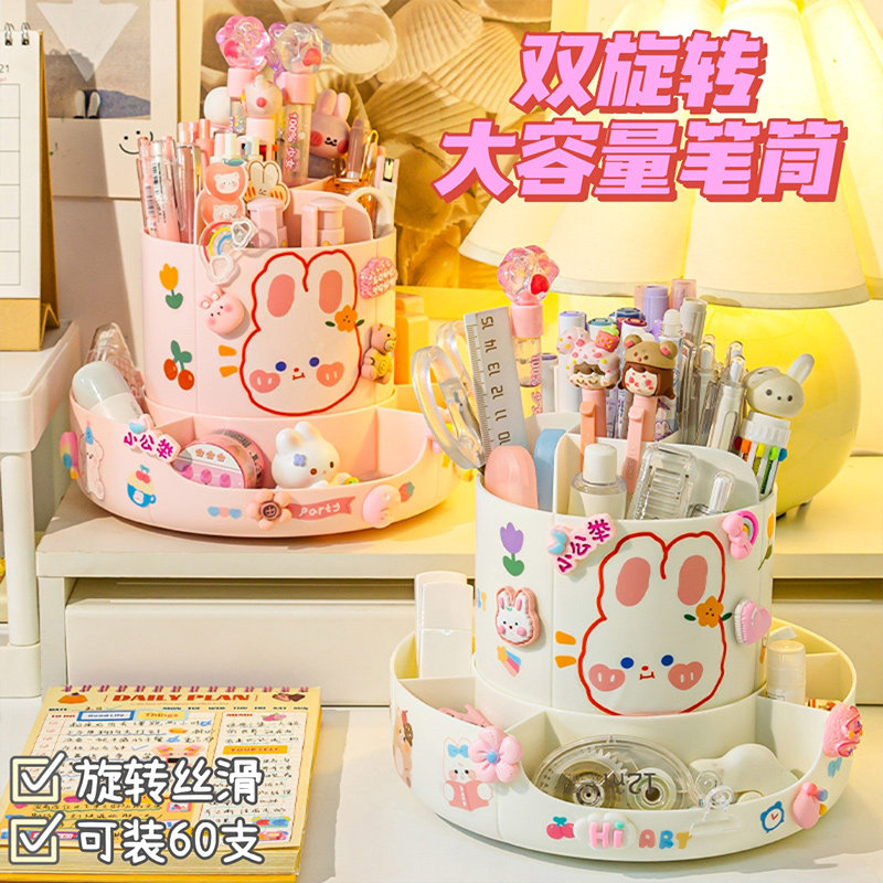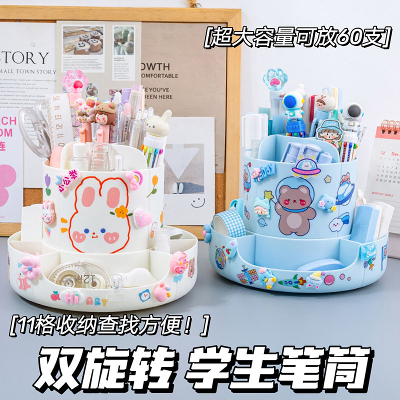 (Double double rotating pen holder) Extra large capacity 360 degrees Cute Desktop Containing Box Elementary School Student Girl Children Desk Pen Barrel Girl Boy Putting Pen's Creative Multifunction Pen Box-Taobao