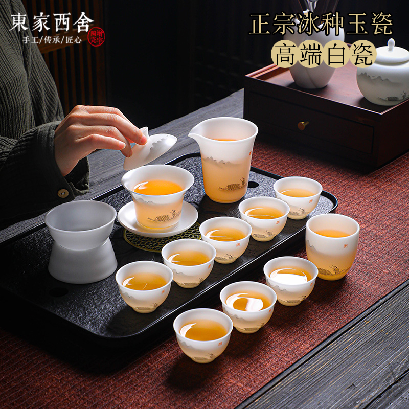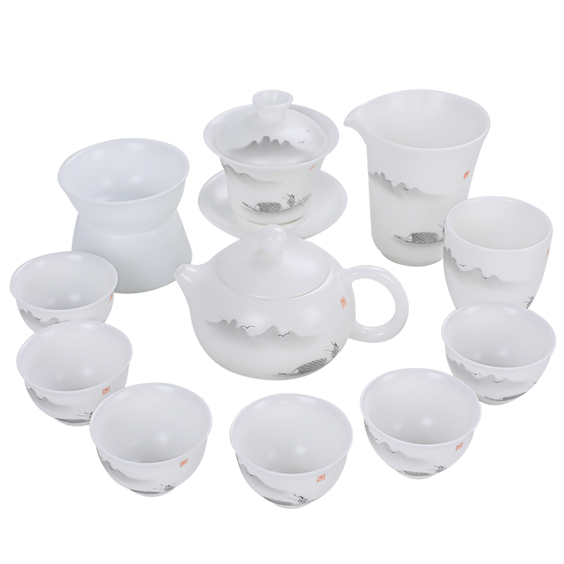 Defied White Porcelain Ice Seed Jade Porcelain Kung Fu Tea Set Hand-painted Ink China Wind Suit Vegetarian Burning Goat Fat Jade Lid Bowl Teapot-Taobao