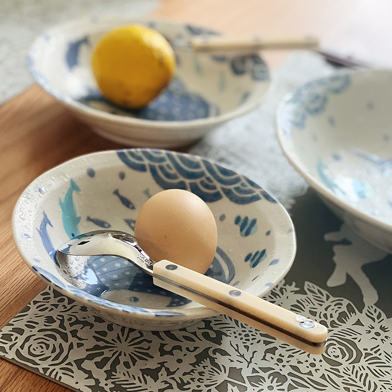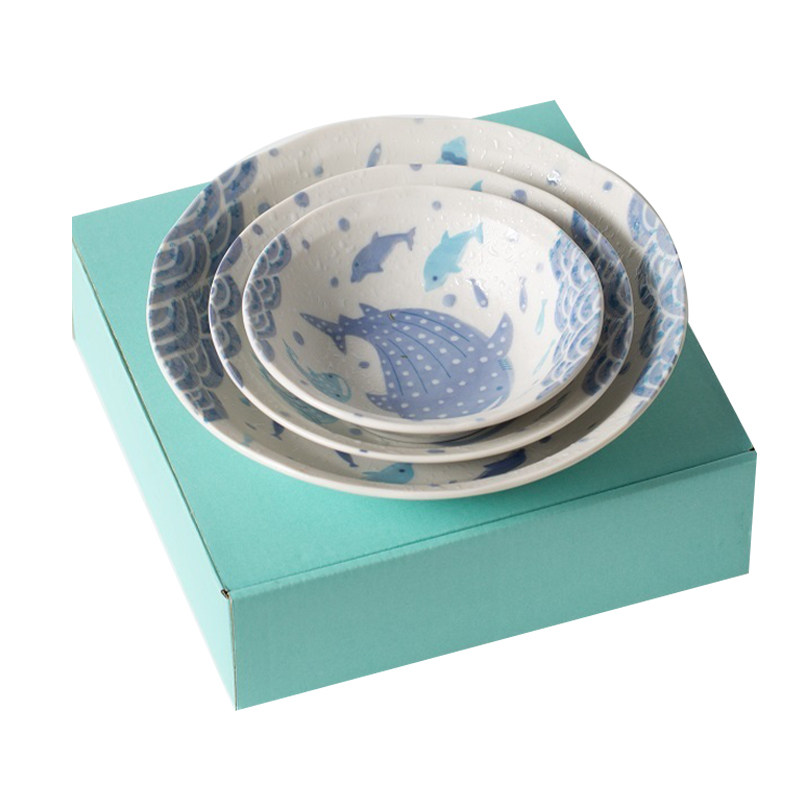Life was originally made in Japan Shemi blue ocean story ceramic bowls and dishes three-piece combination Mino burnt gift set