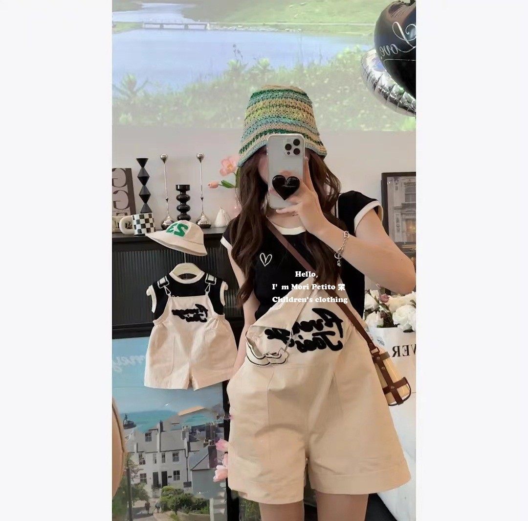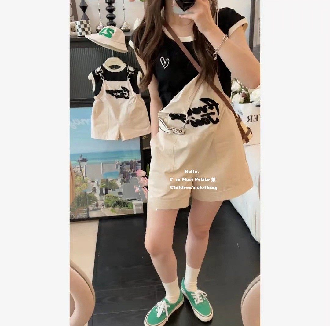 Fried Street Mother-and-son Dress 2023 New Tide Letters Embroidered Children Braces Shorts Pro-Son Dress Summer Mother Women Dress Suit-Taobao