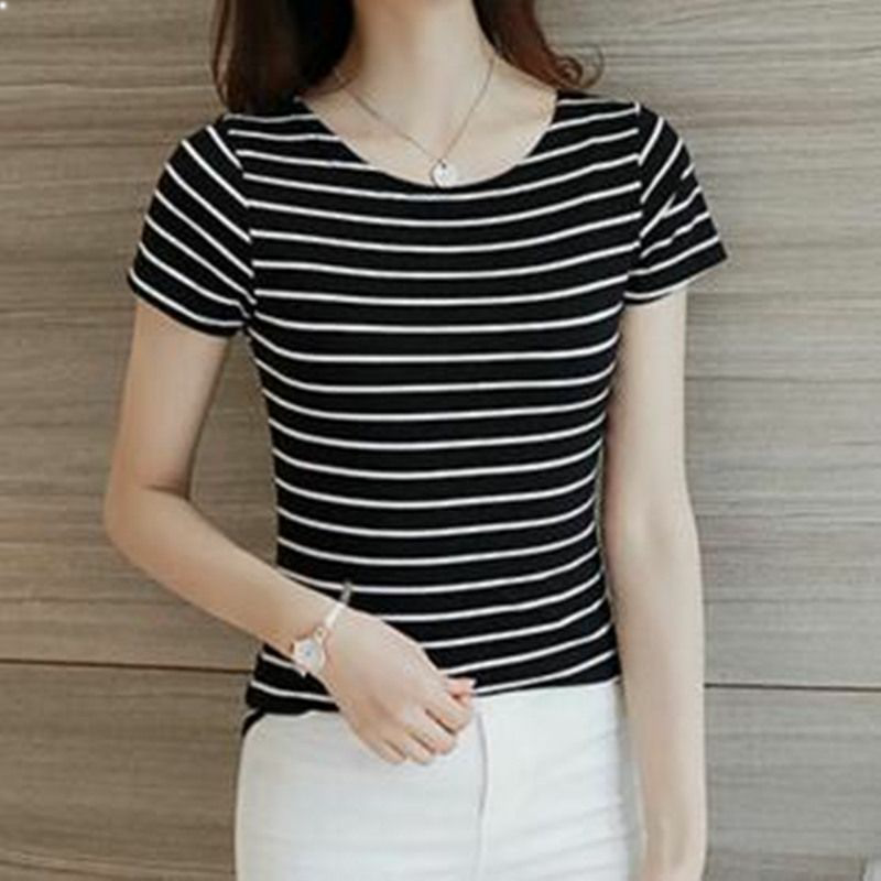 Short-sleeved women's summer new Korean version black and white striped short-sleeved t-shirt women's round neck all-match self-cultivation bottoming top women