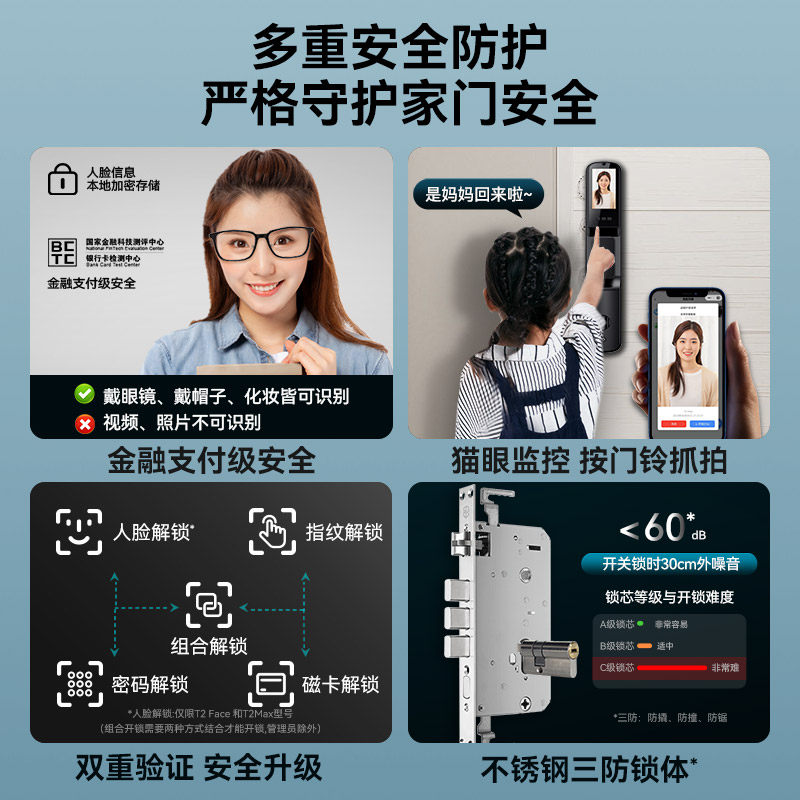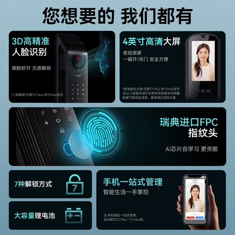T2 (standard version stainless steel noise reduction lock body) T2 (reinforced version stainless steel noise reduction lock body) T2Face (standard version 3D face recognition stainless steel noise reduction lock body) T
