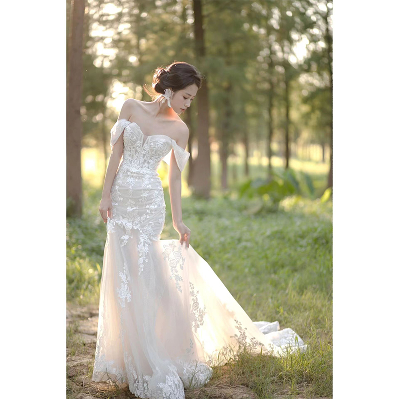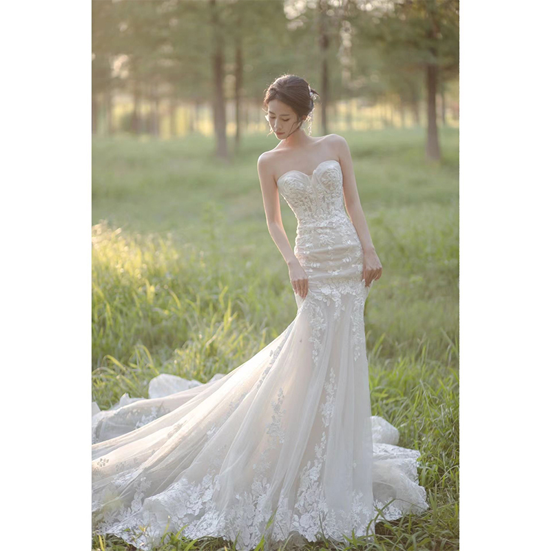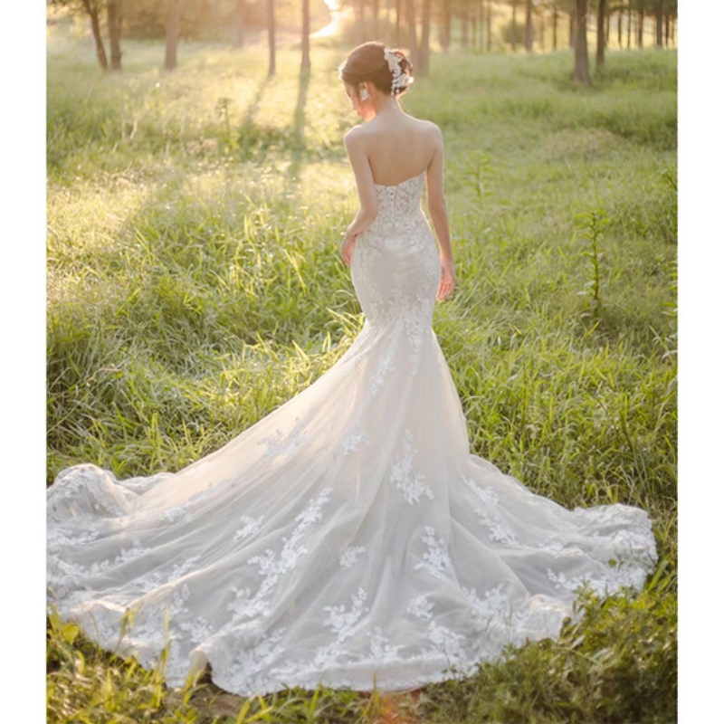 Lace fishtail wedding dress 2024 new tube top going out light gauze temperament travel photography outdoor lawn wedding tail dress