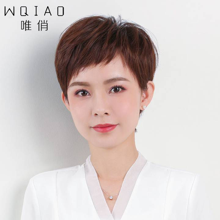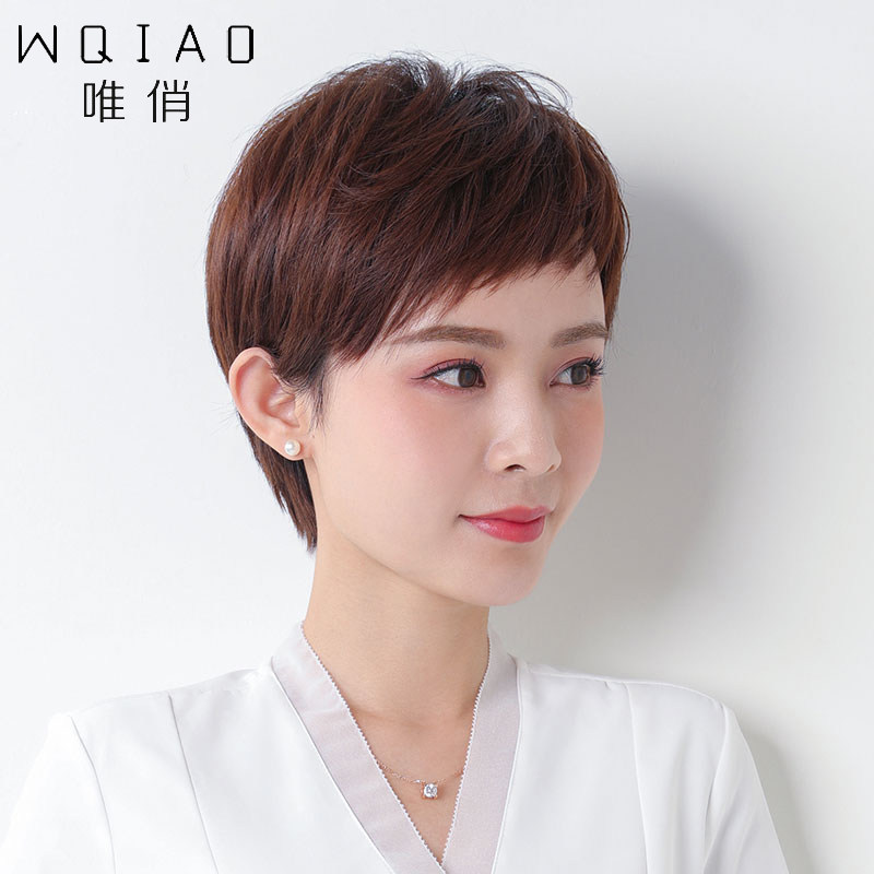 Wig Woman Short Hair Middle Aged Mother's Genuine Hair all-halal, Oblique Liu Hai All Headgear Textured Hierarchy Short Hair-Taobao