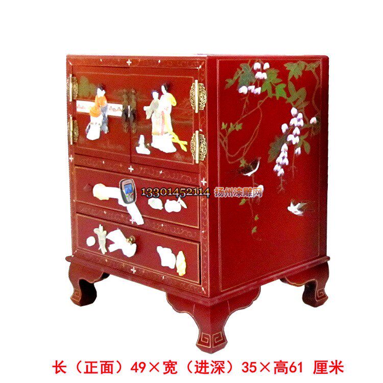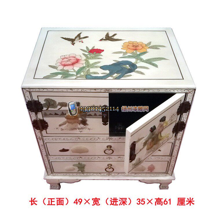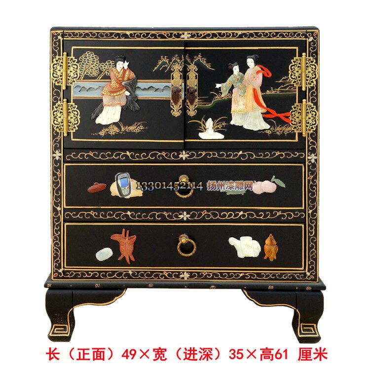 Lacquer bone stone inlaid character multi-color double door double draw bedside decorative cabinet Yangzhou lacquer art solid wood classical furniture