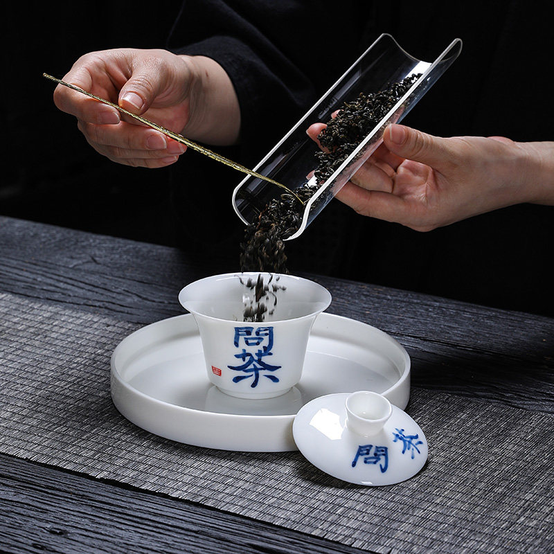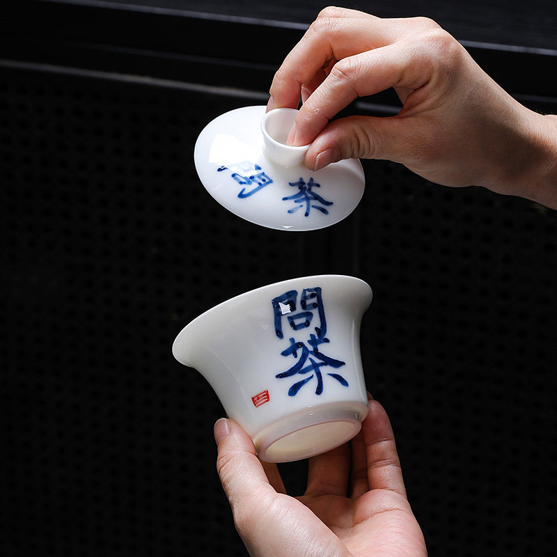 Goat Fat Jade Handwritten Calligraphy Hovering Three Talents Cover Bowl Tea Cup Single Lid White Porcelain Tea Set Ceramic Suspended Toast Tea Bowl-Taobao