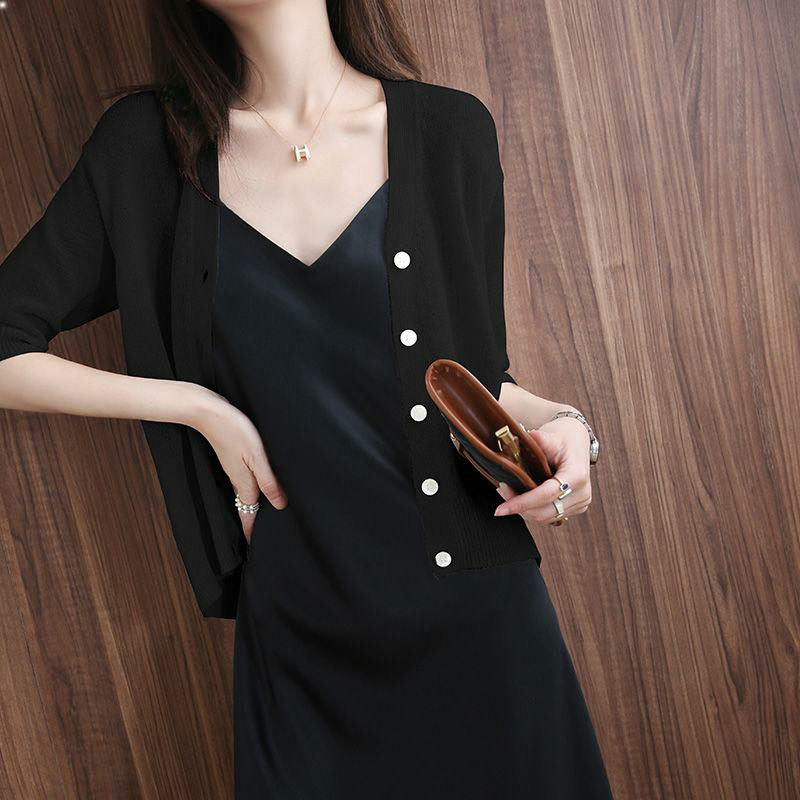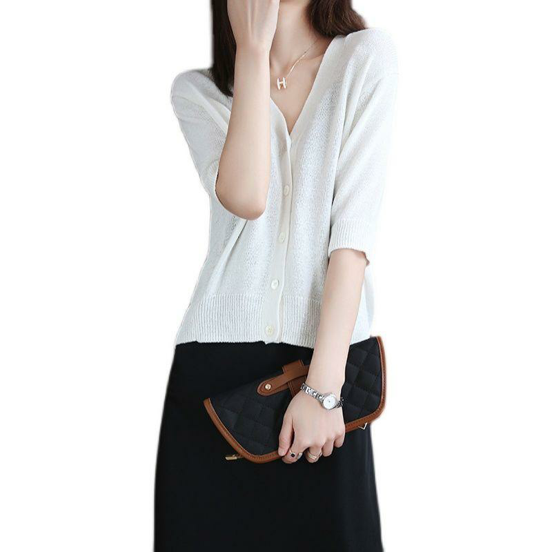 Retro summer new V-neck knitted cardigan women's thin ice silk loose sunscreen air-conditioning jacket short sleeves