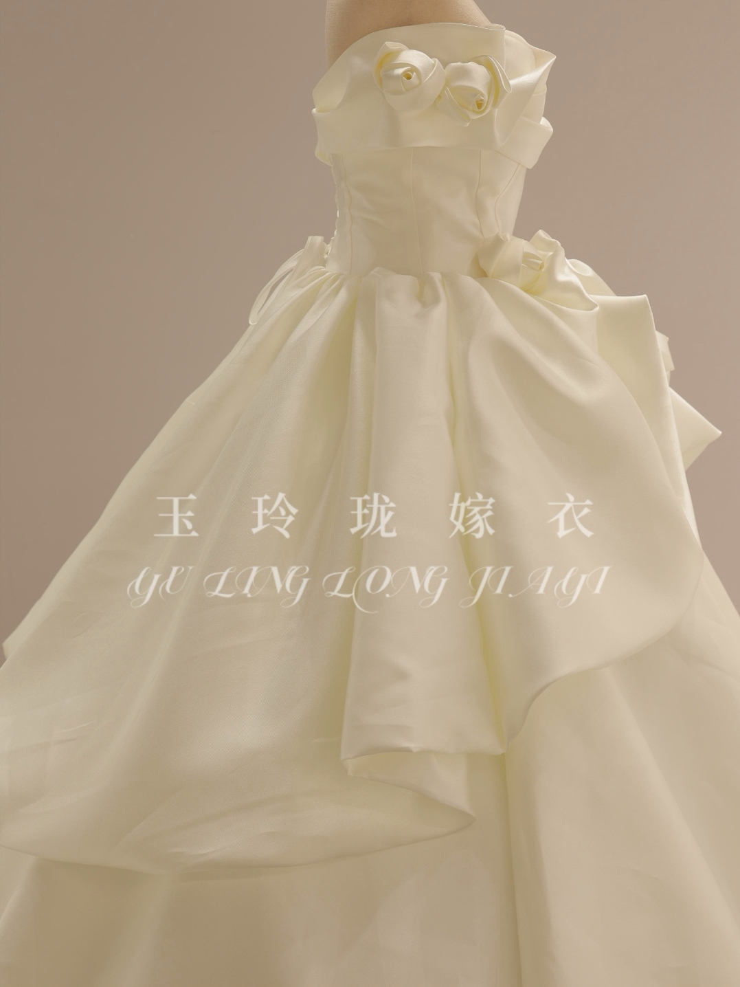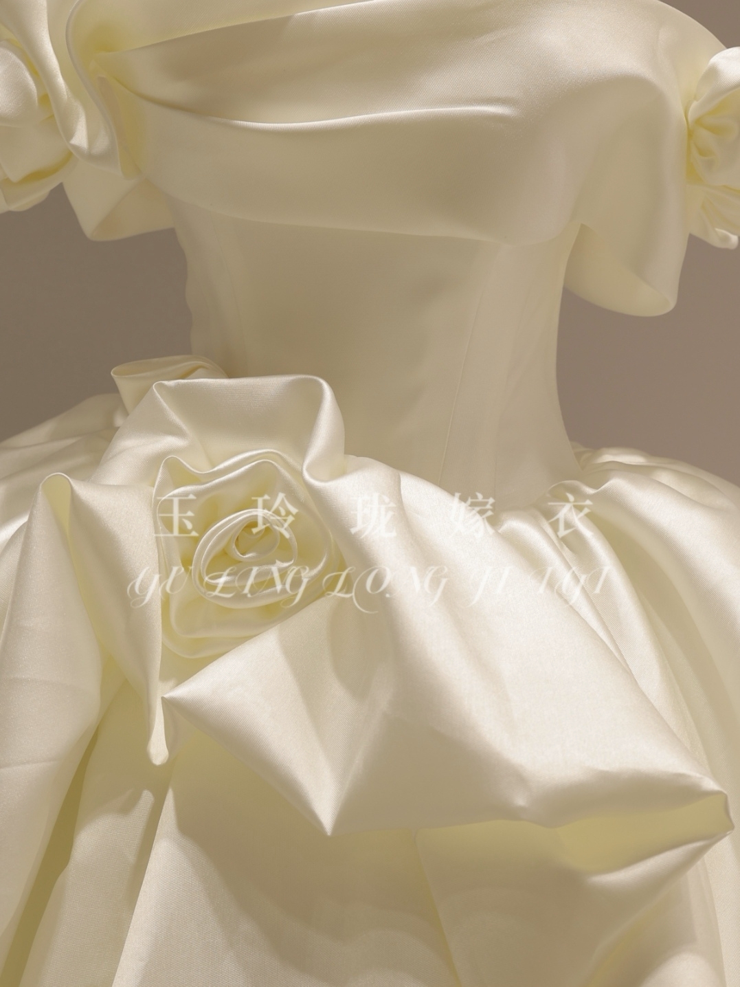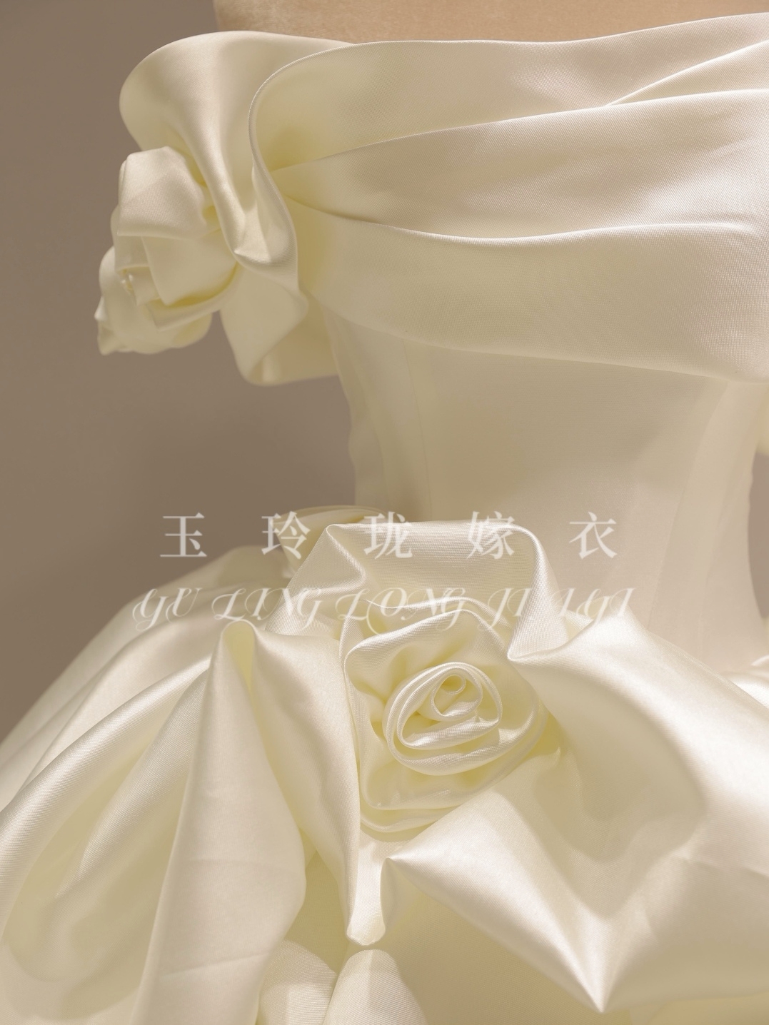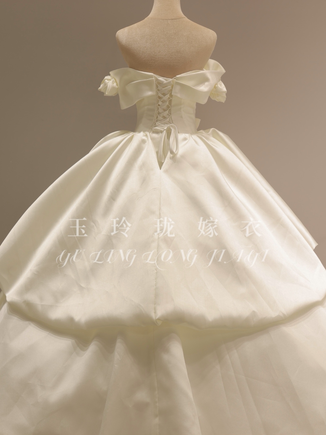 One-word shoulder wedding dress French satin 2023 new winter bridal trowel pleas to collect waist display slim texture main yarn-Taobao