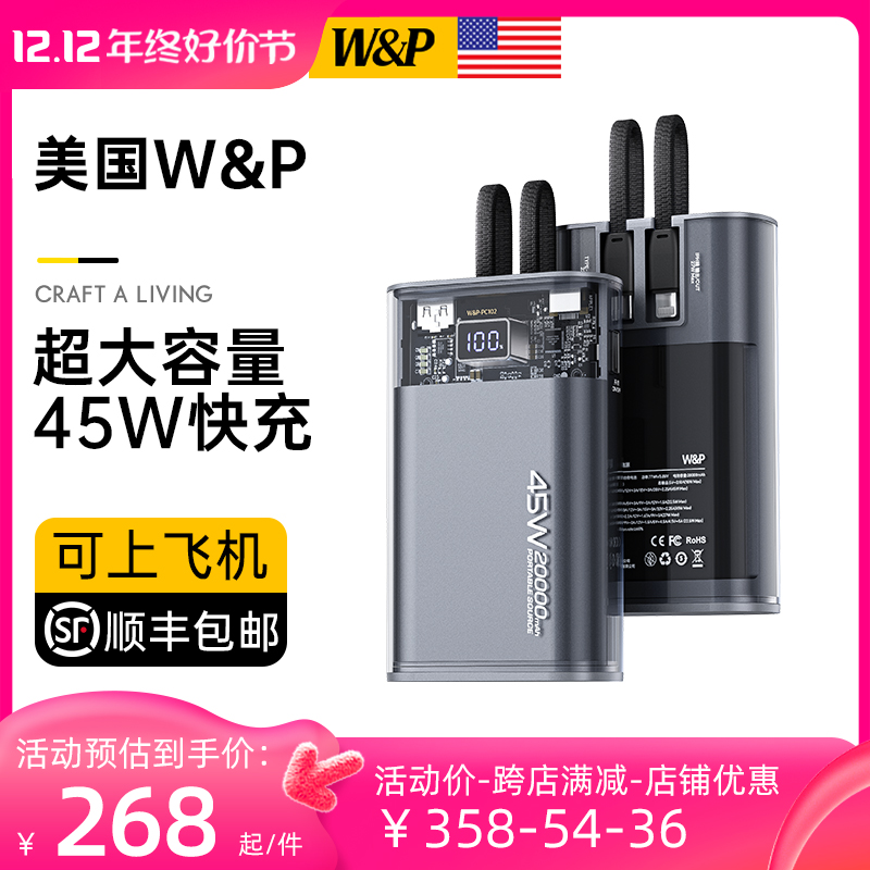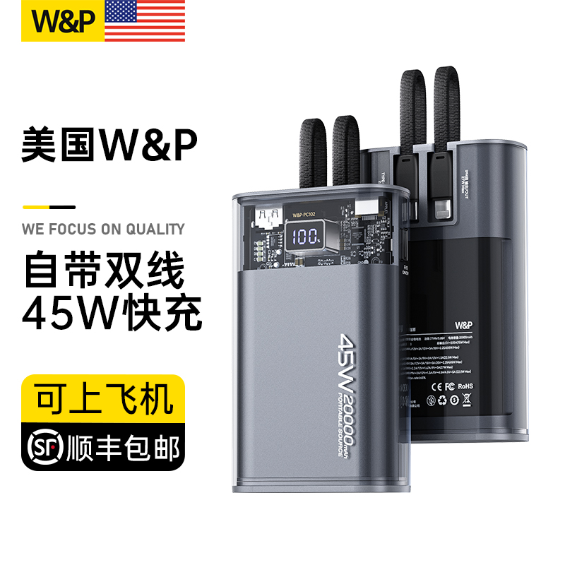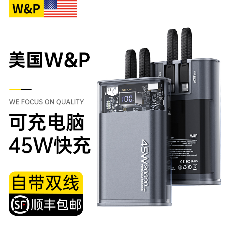 (US WP) Charging Bao Capacity Extra Large 20000 mAh Bring Your Own Line 45W Two-way Quick Charge Applicable iPhone15 Apple 14 Mobile Phone iPad Laptop Xiaomi Mobile Electric