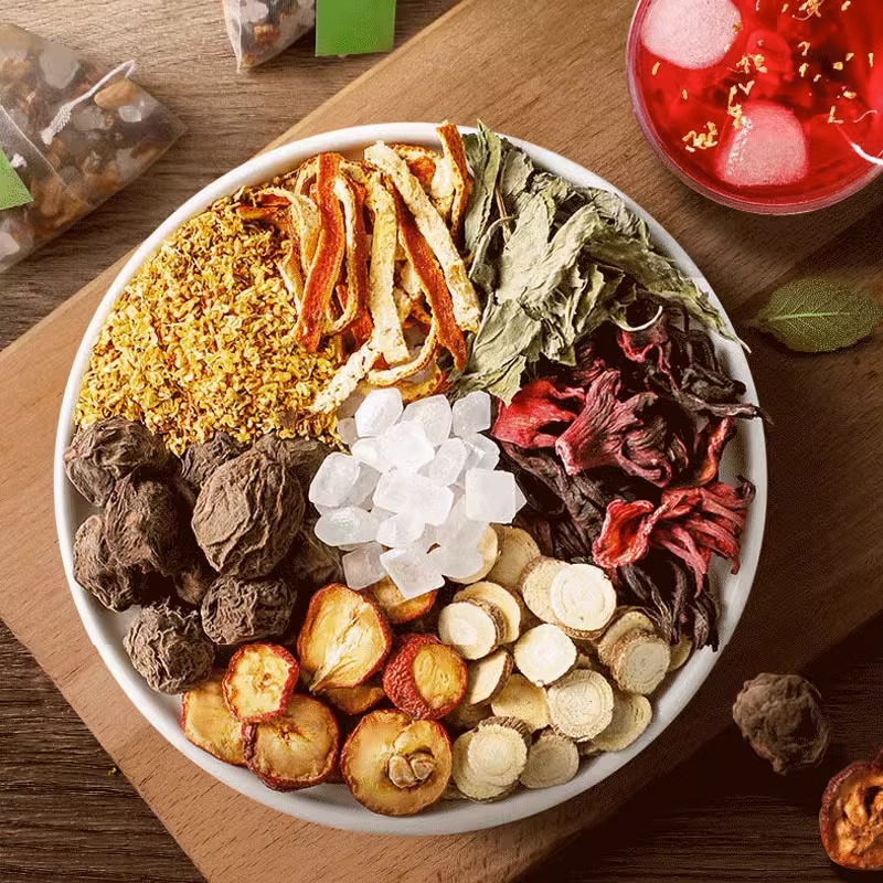 Black plum licorice, orange peel, mountain plant, lotus leaf, mulberry, roselle, mint, osmanthus rock sugar