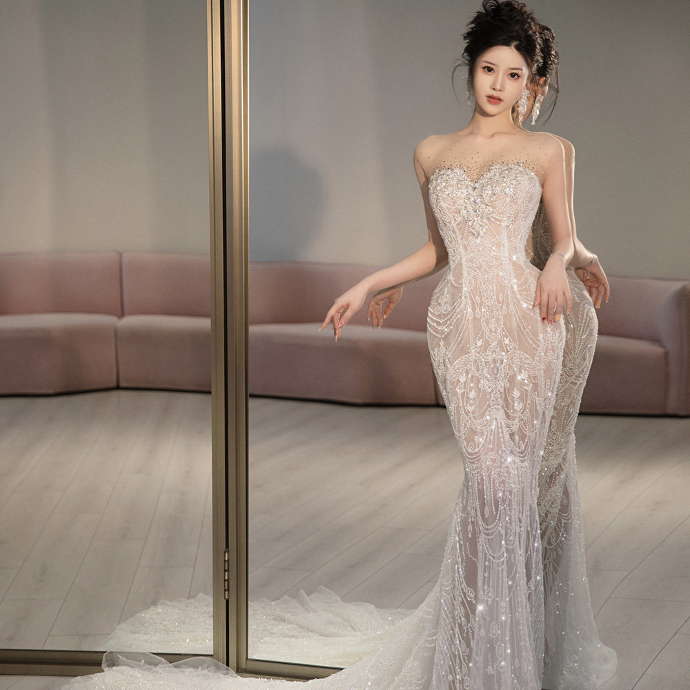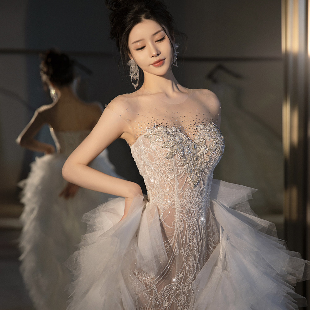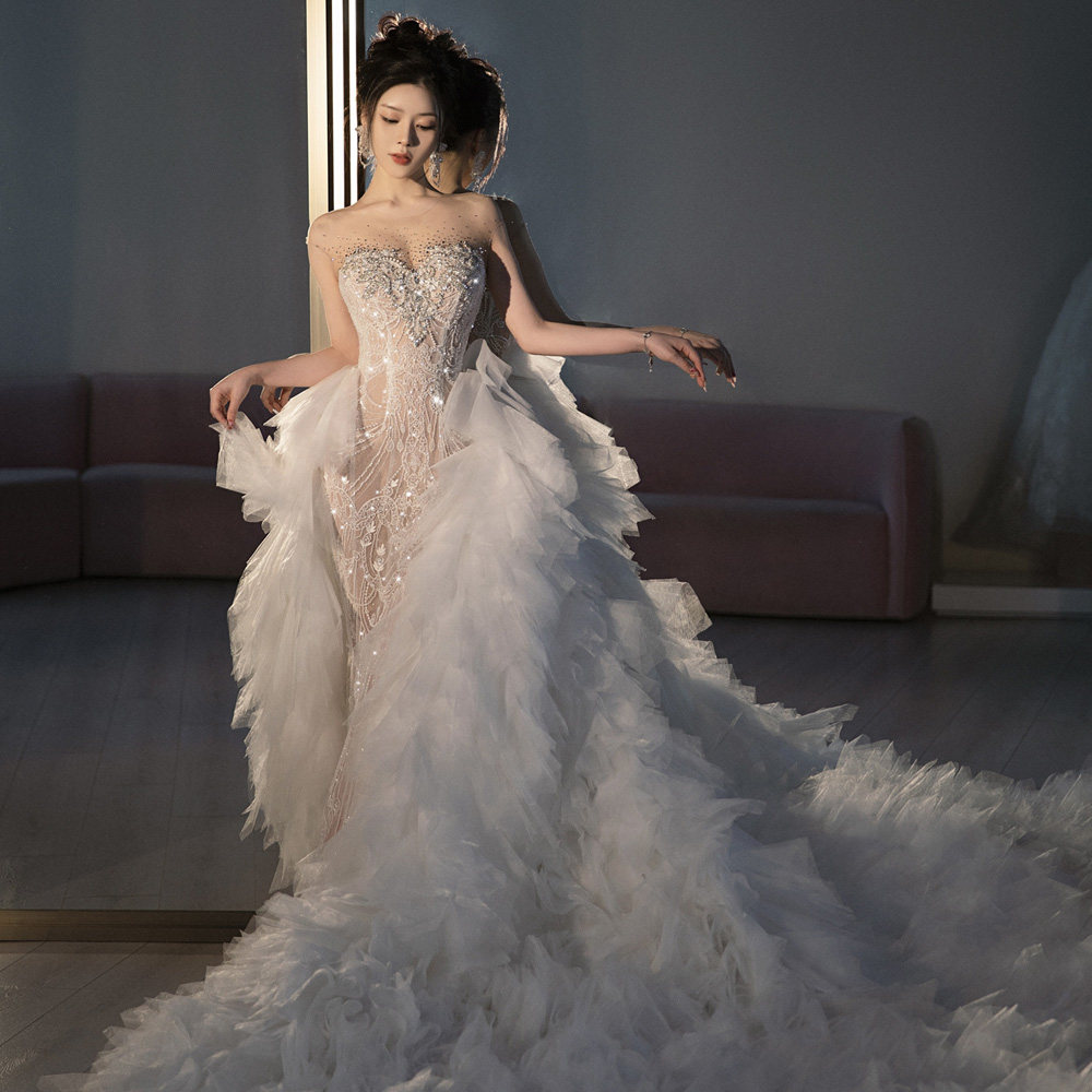 French dress fishtail light main wedding dress retro 2024 new forest style tube top bridal veil luxury