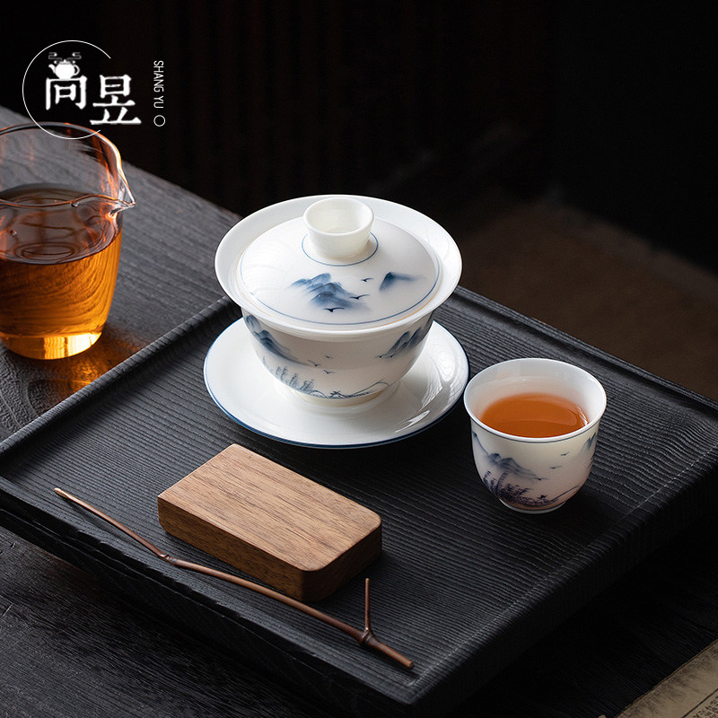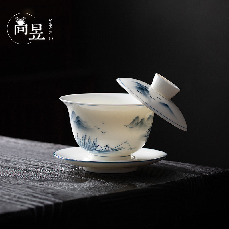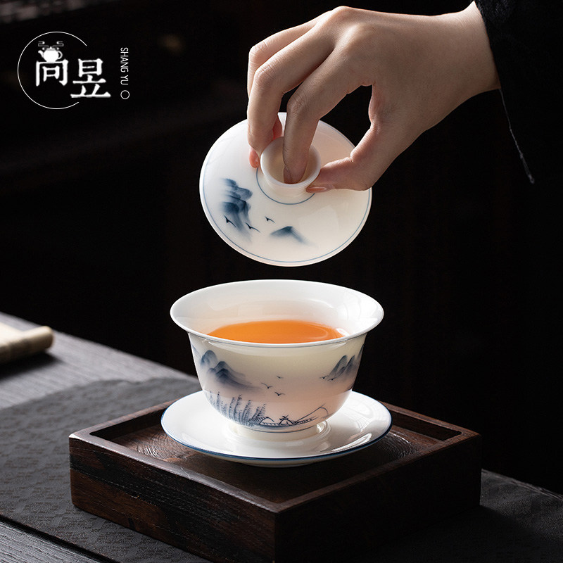 Hand painted goat fat jade white porcelain can hover three-only cover bowl Tea Cup Single Lake Light Mountain Color Bubble Tea Bowl ceramic Gongfu Tea-Taobao
