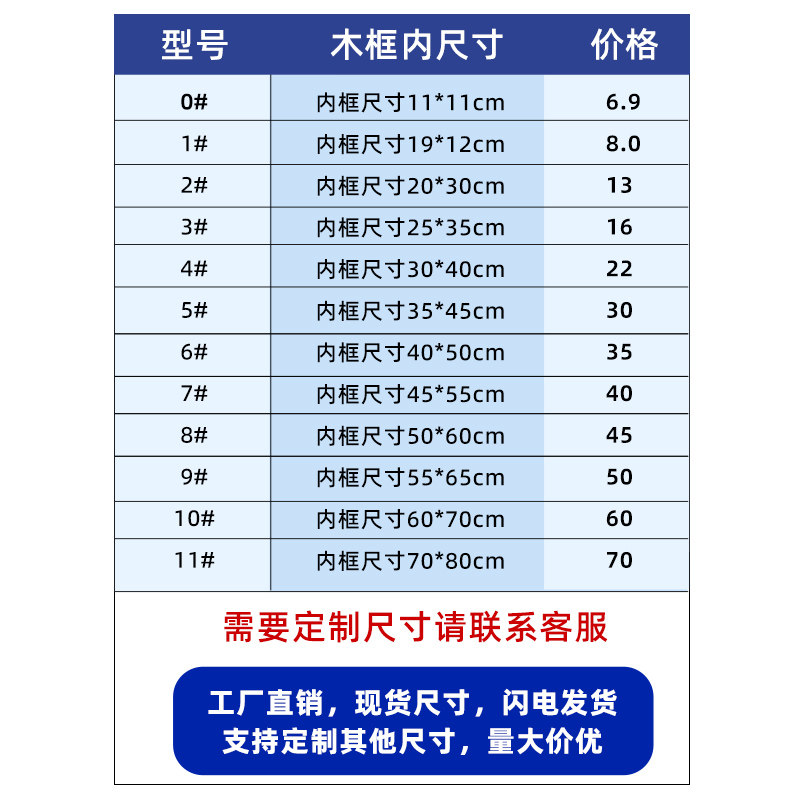 #0内框尺寸11* 11cm (100 mesh suitable for offset printing)#1内框尺寸19* 12cm (100 mesh suitable for offset printing)#2内框尺寸20* 30c