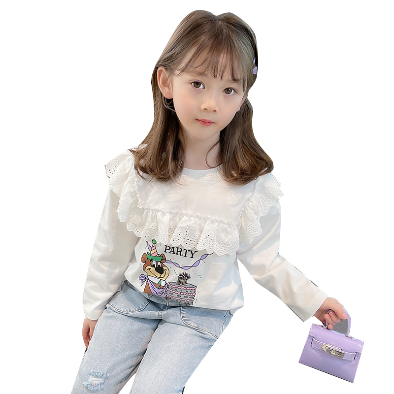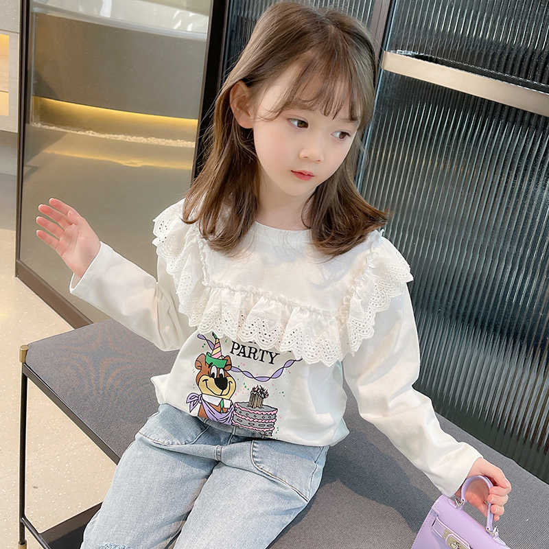 Girl Long Sleeve T-shirt Autumn Dress 2023 New Ocean Gas Korean Version Girl Lace Side Pure Cotton Jersey Kid Blouse-Taobao