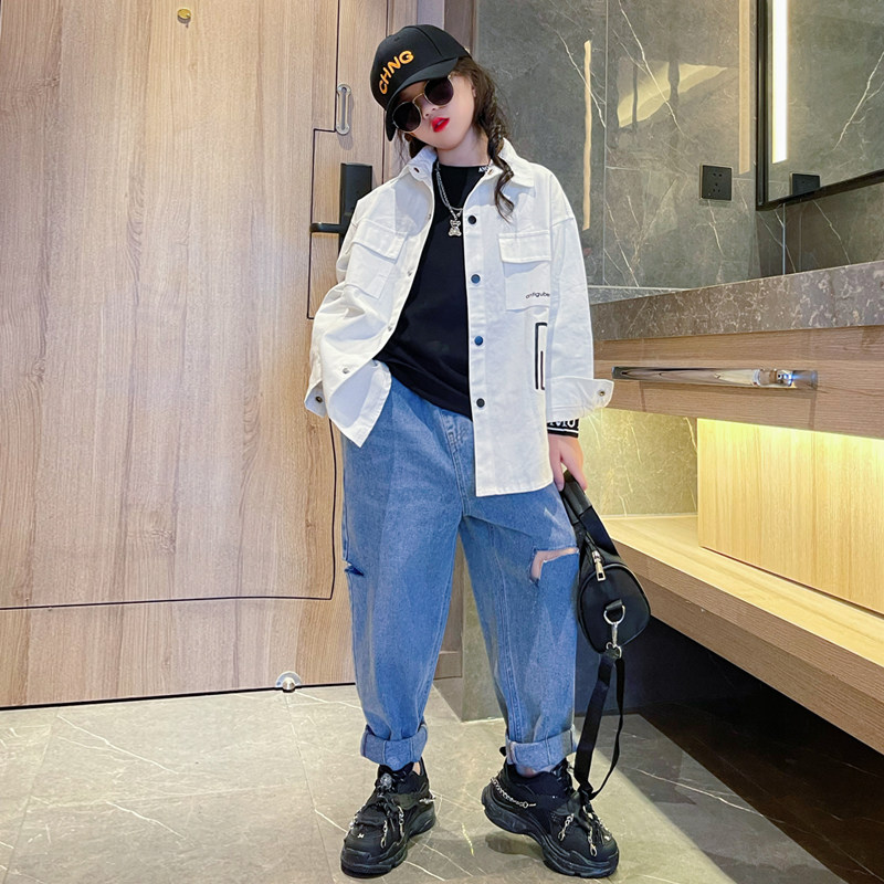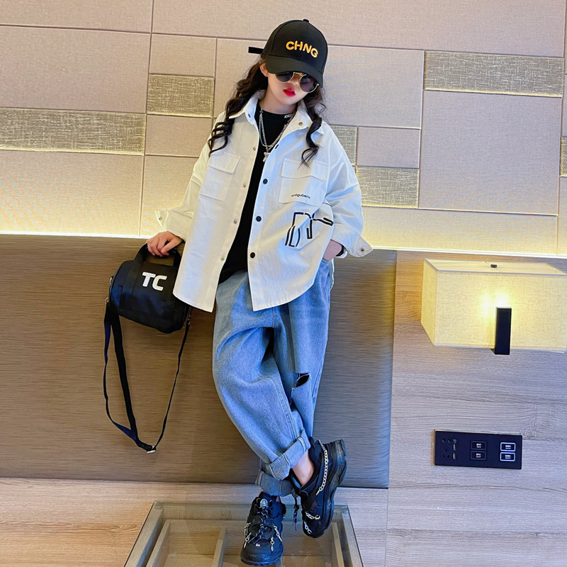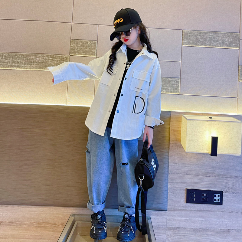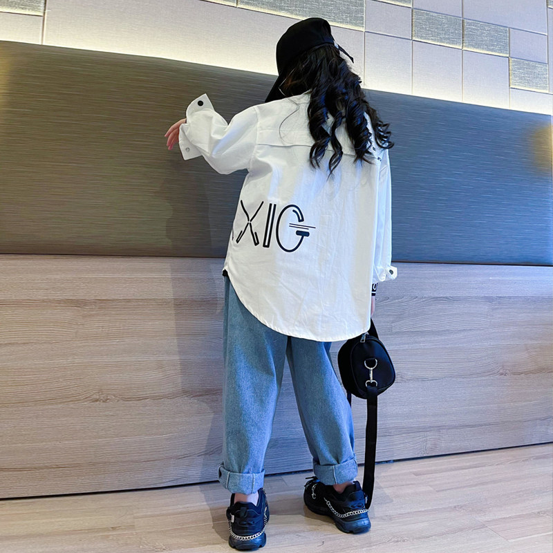 Korean shirt girl's long section 2023 fall new spring and autumn net infrared cover children's foreign air thin autumn clothes-Taobao