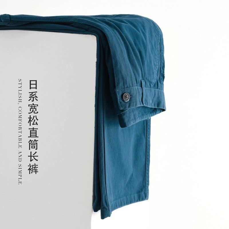 Small frescoed peacock blue day ensemble retro pure color minimalist straight cylinder long pants male loose 100 lap casual pants woman autumn-Taobao