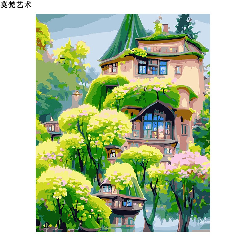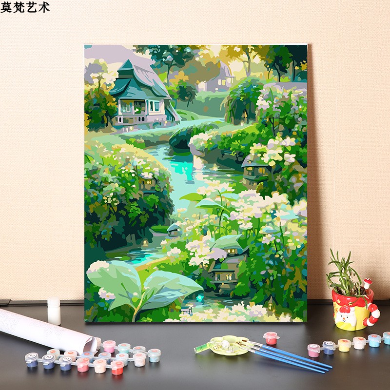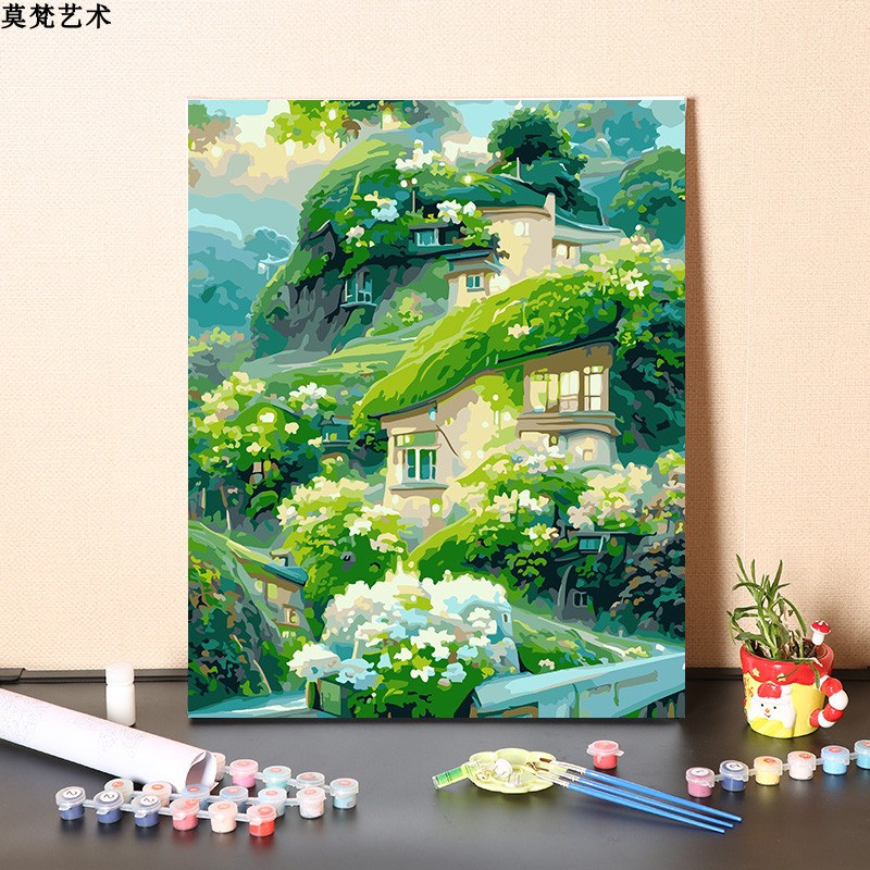 Digital oil painting Diy padding by hand Miyazaki Jun Wind Healing Water Lodge Wind Landscape Painting color Colored Propylene Painting-Taobao
