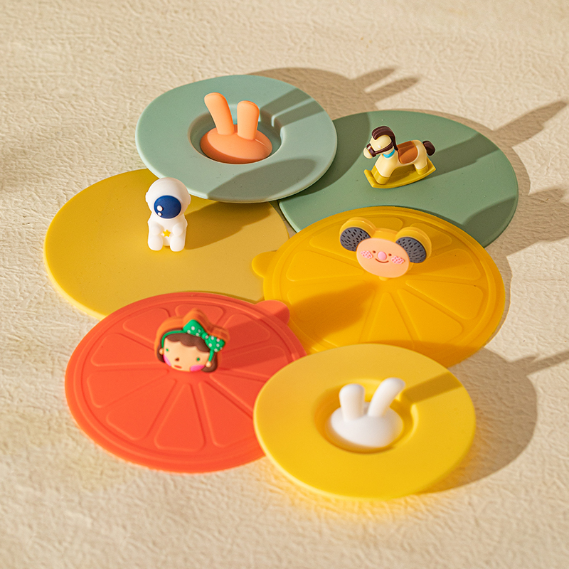 Silicone cup lid 115mm (butterfly girl) silicone cup lid 115mm (kola) silicone cup lid 120mm (yellow rocking horse) silicone cup lid 120mm (astronaut