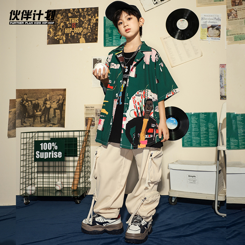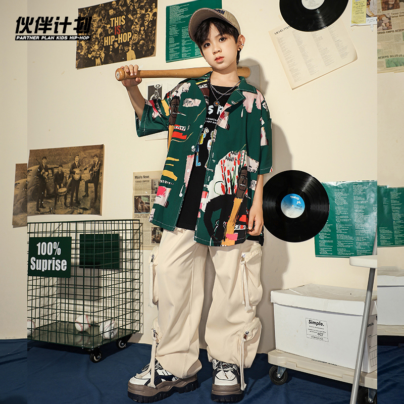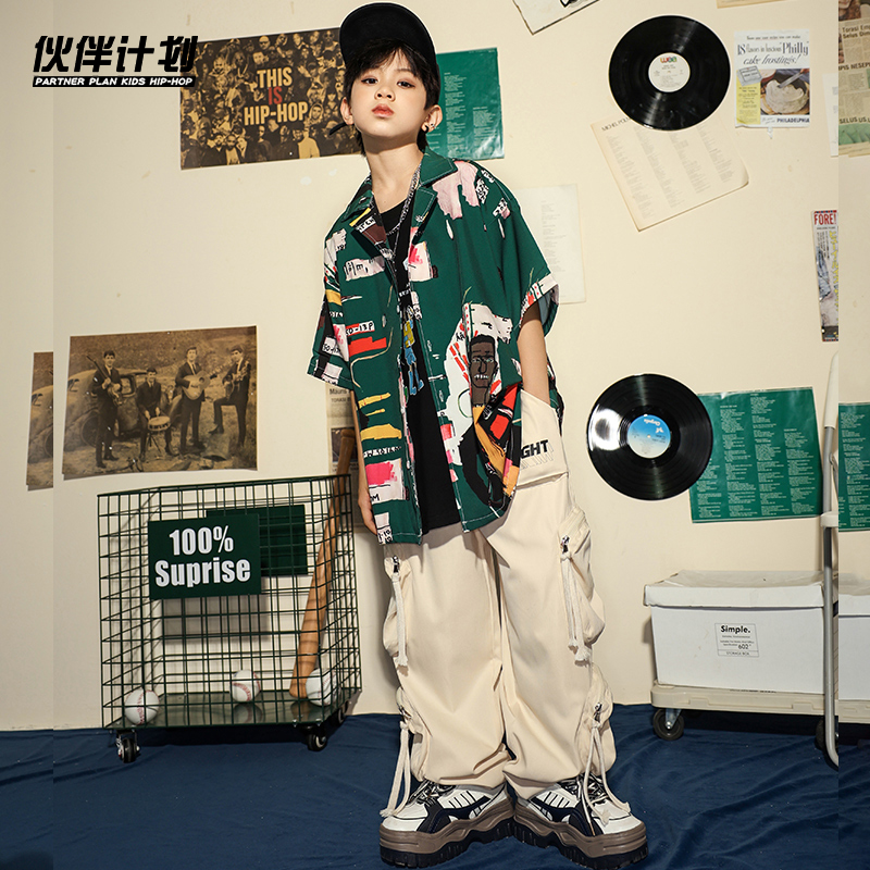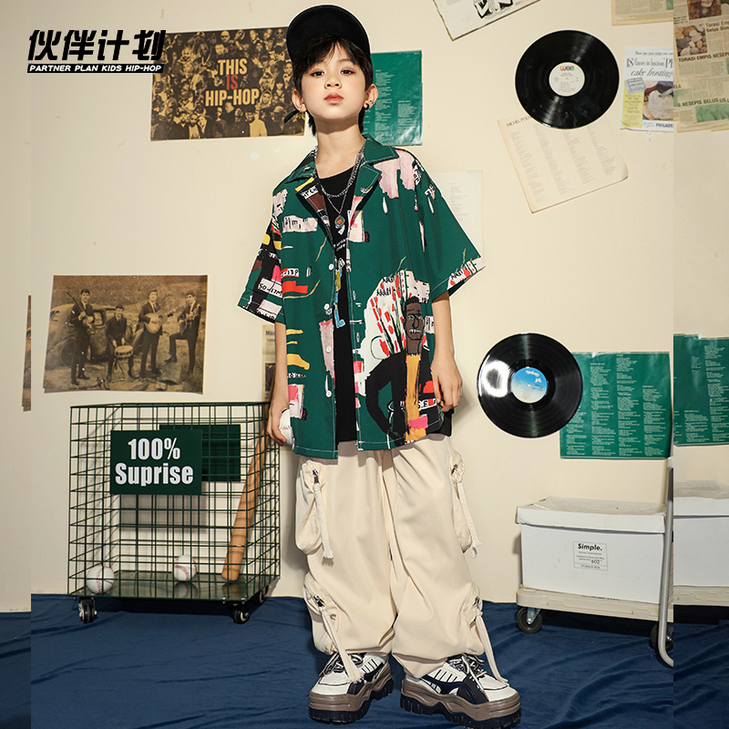 Street dance Children's boomer suit for male and female hip-hop hiphop handsome young children Summer Hong Kong Wind shirt performance out of the suit-Taobao