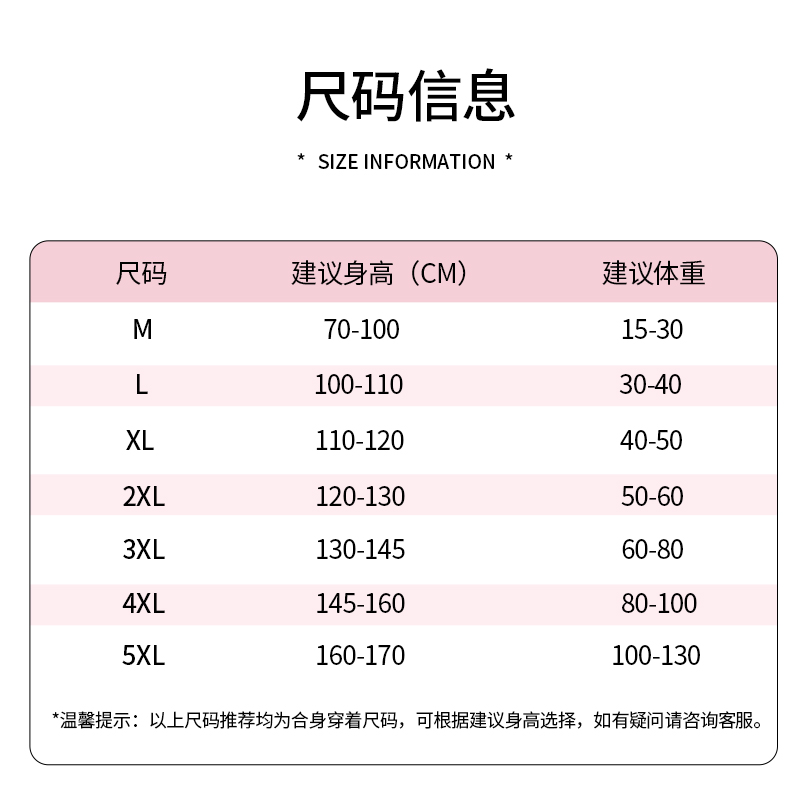 L (recommended for height 95-110cm weight 30-40 catty) XL (recommended for height 110-120cm weight 40-50 catty) 2XL (recommended for height 12