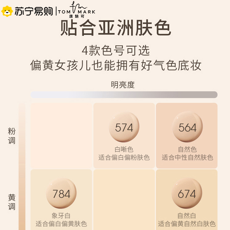 Natural White 674 (suitable for a partial yellow natural white complexion) White fair colour 574 (suitable for partial white partial pink complexion) Natural color 564 (suitable for neutral natural complexion)