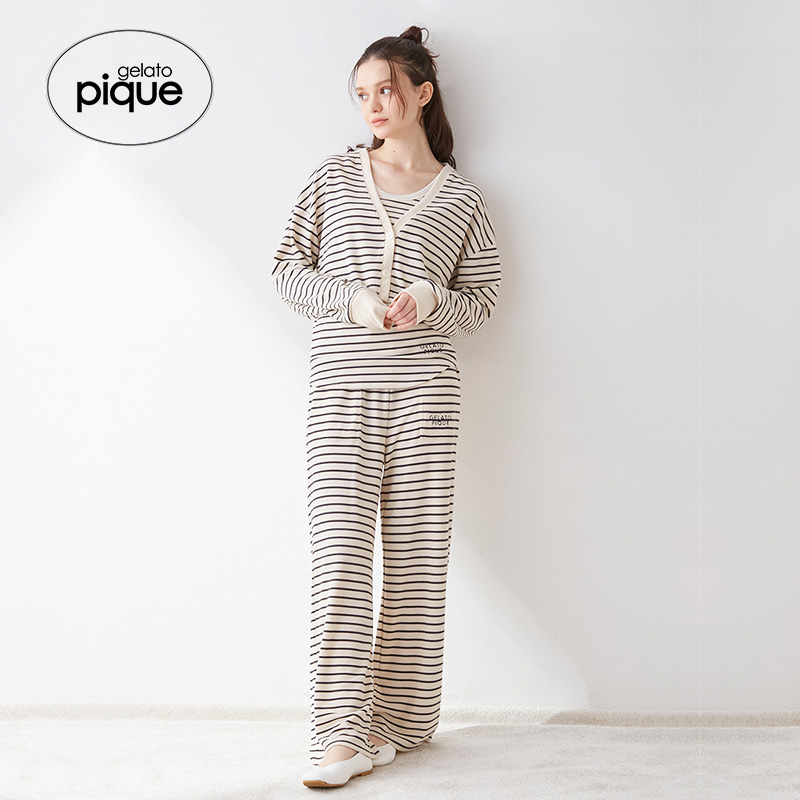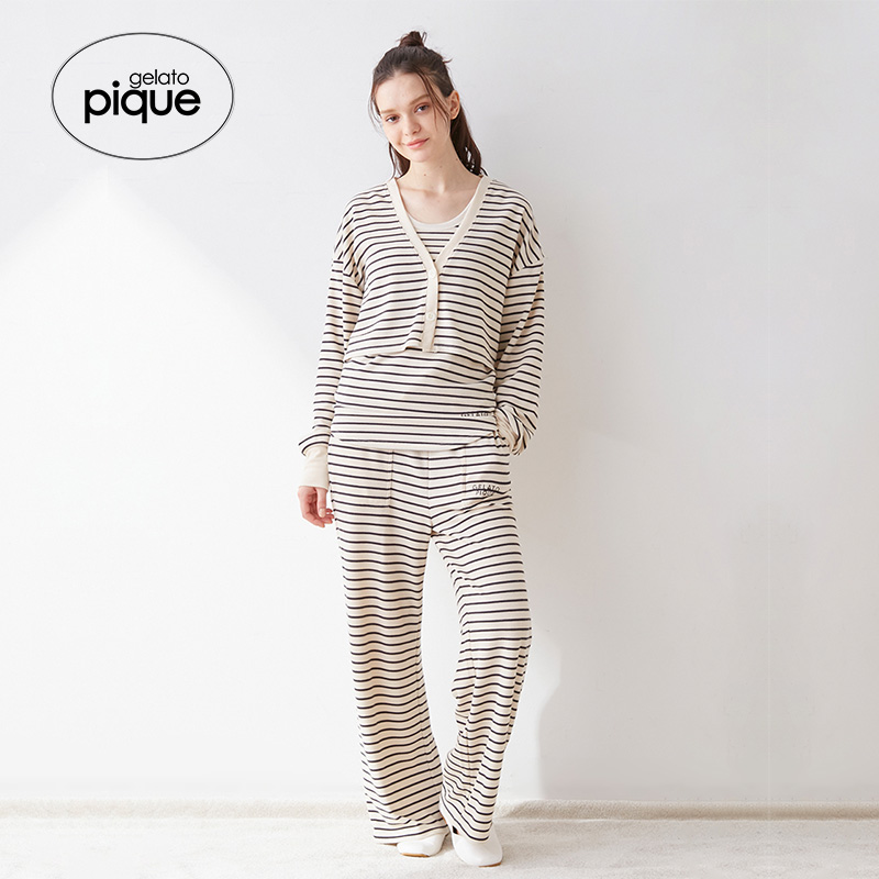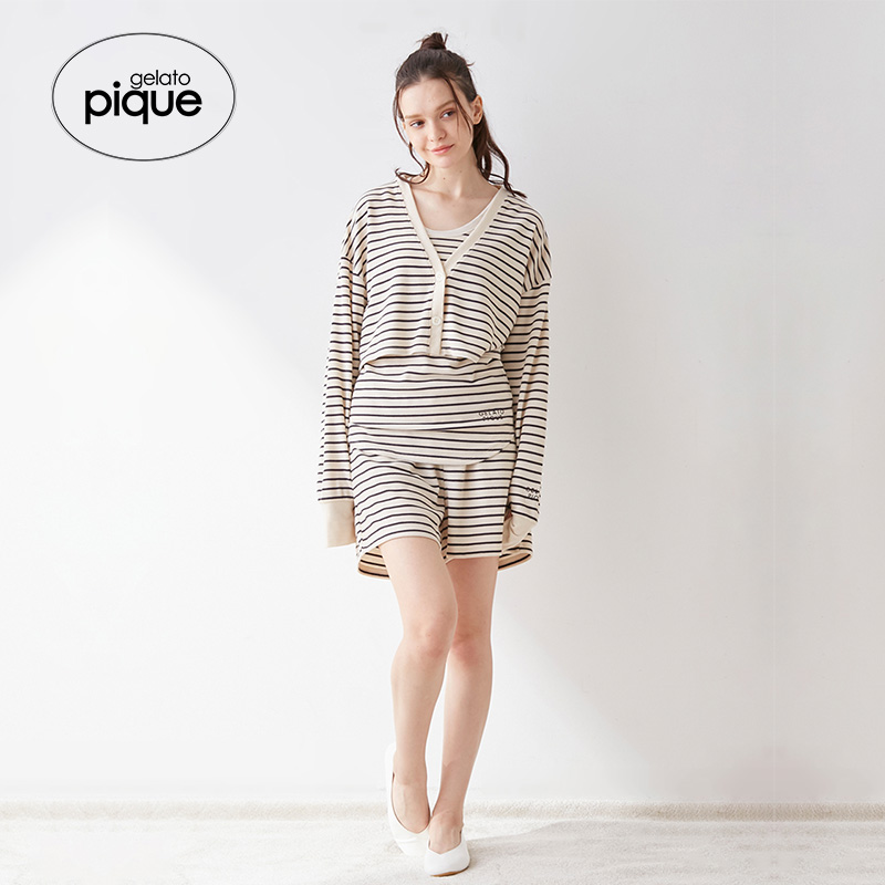 gelato pique23 autumn winter new pint woman pyjamas pure color striped long sleeve V collar open shirt PWCT234370 -Taobao