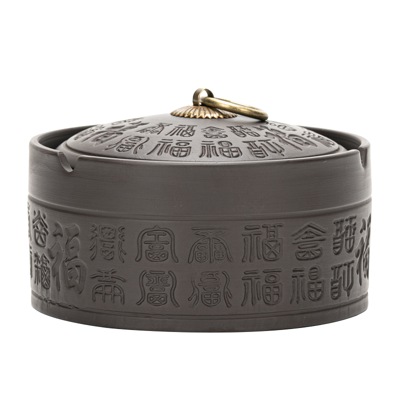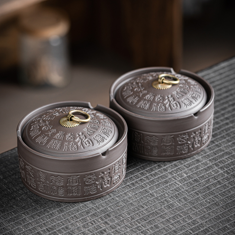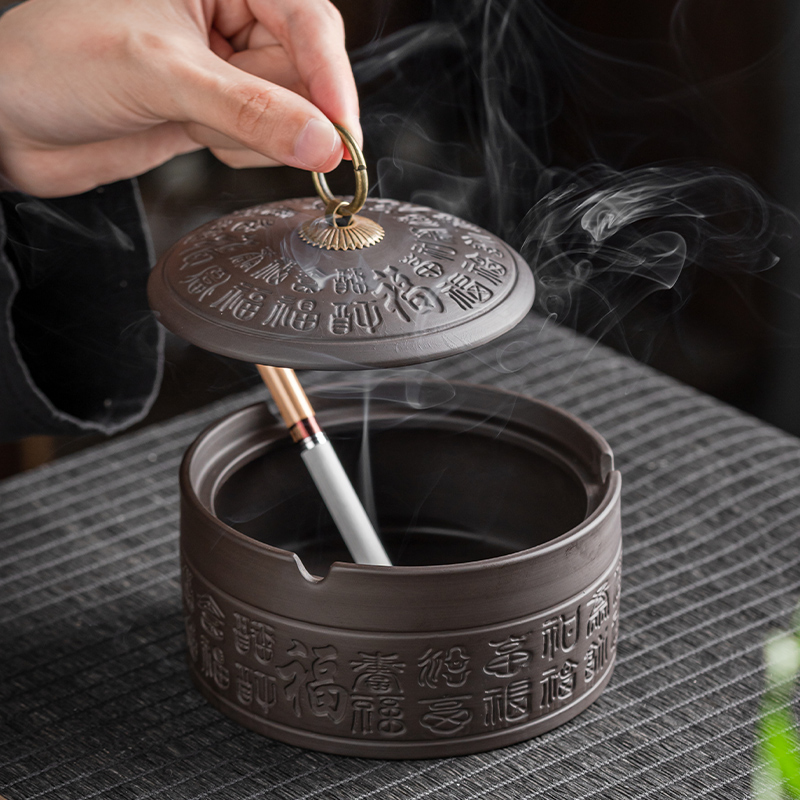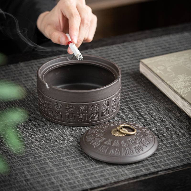 High-end large size purple sand ashtray Smoke smoke cylinder Smoke cigarette box Retro Modern Chinese style home office with cover anti-fly ash-Taobao