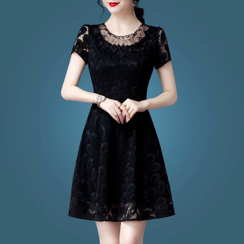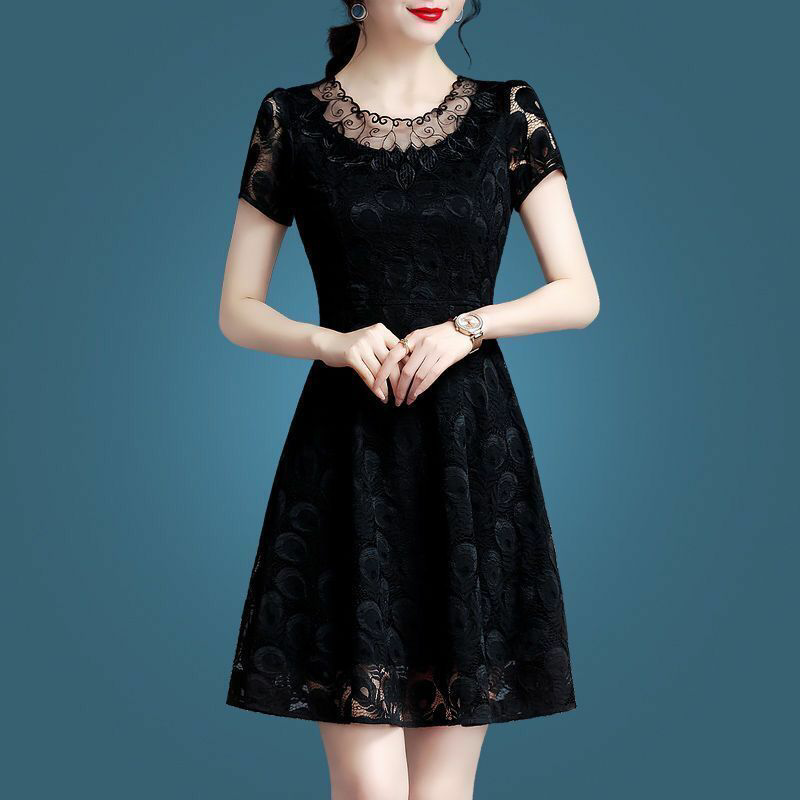 Summer Temperament Black Lace Short Sleeve One-piece Dress Slim New Big Code Woman Dress Fat Mm Covered With Long Dresses A dress-Taobao