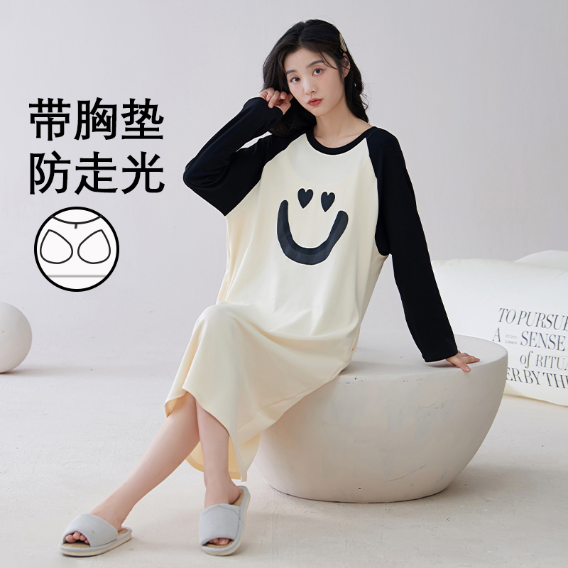 Sleeping dress lady Spring and autumn style pure cotton long sleeves with chest cushion one-piece pyjamas Lady Jane Yoo casual outwear a home dress-Taobao