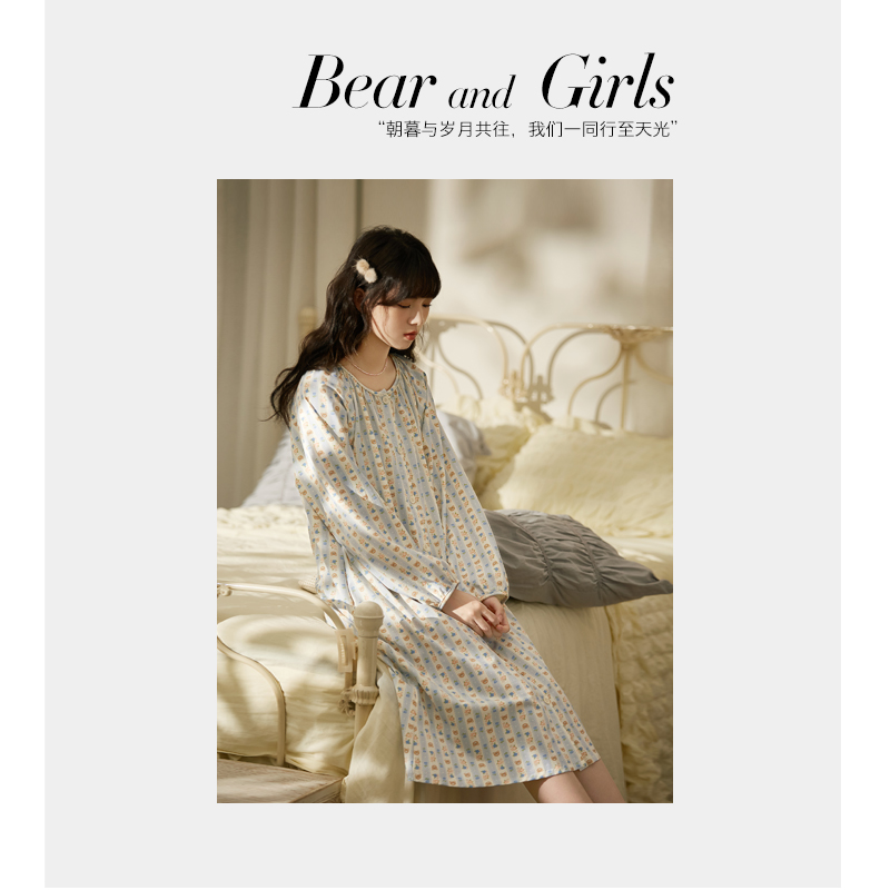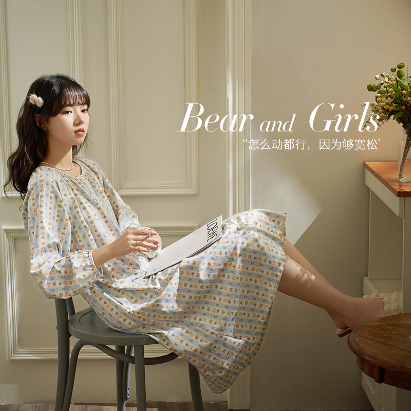 Mrs. Silie Sleeping Sleeping Pyjamas fall Women's Korean Department Round neck Striped Cartoon Long Sleeve Spring Autumn Home Dress-Taobao